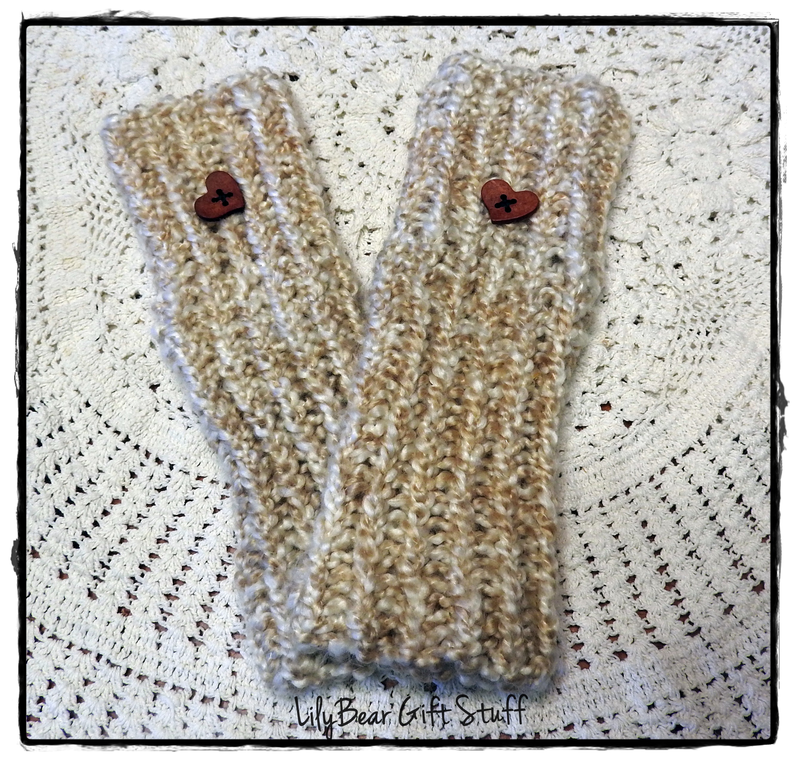 Cream and Tan colored with Heart Fingerless Gloves, Loom Knit