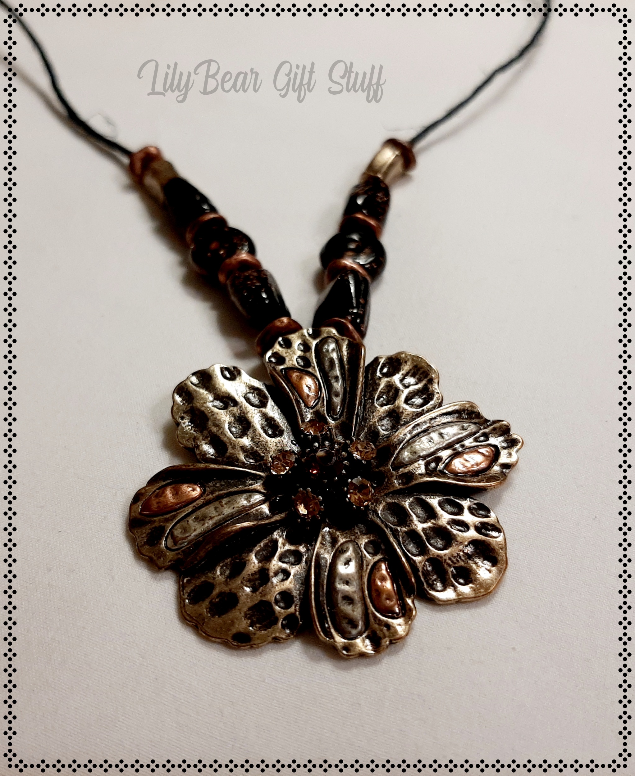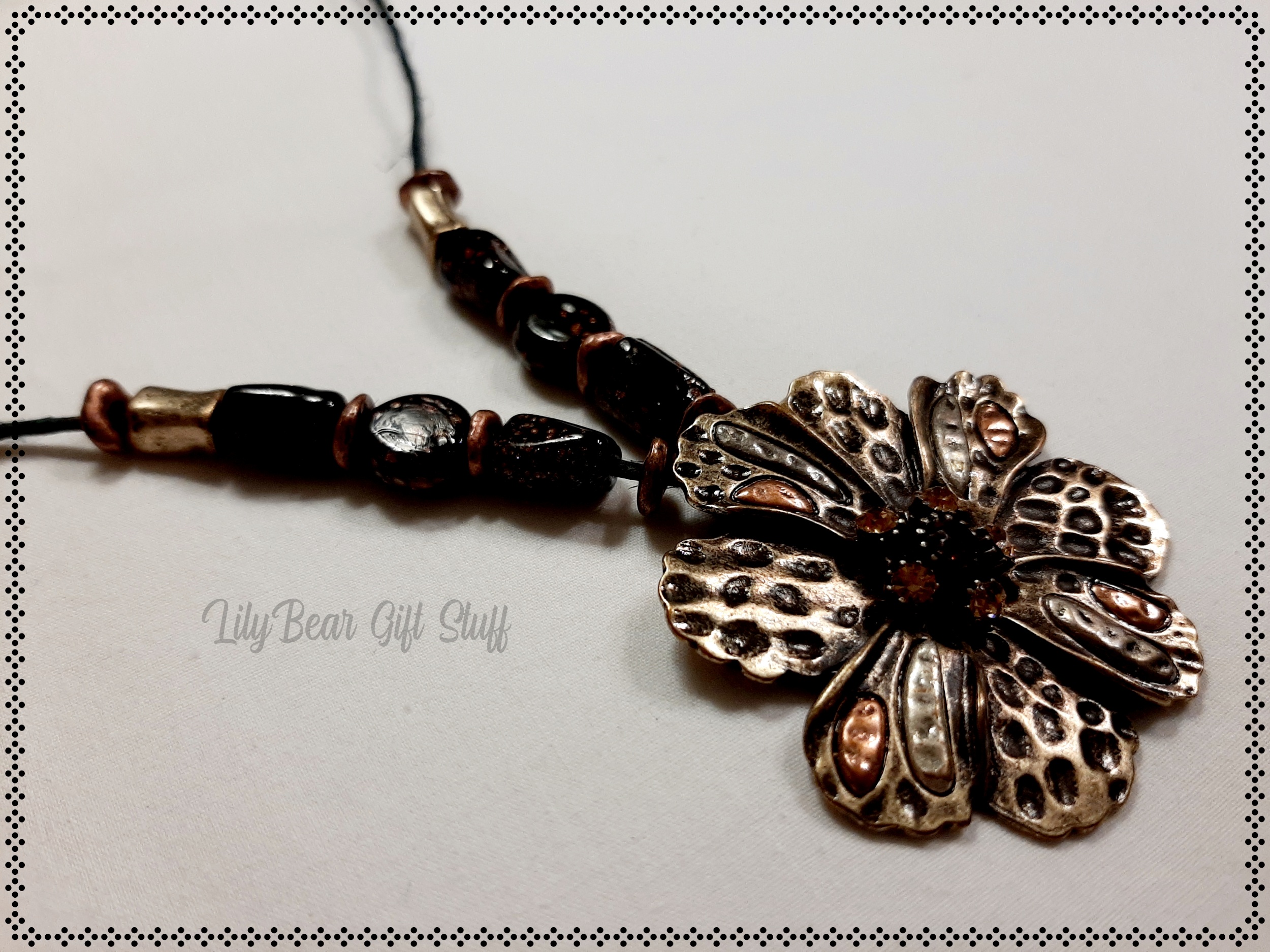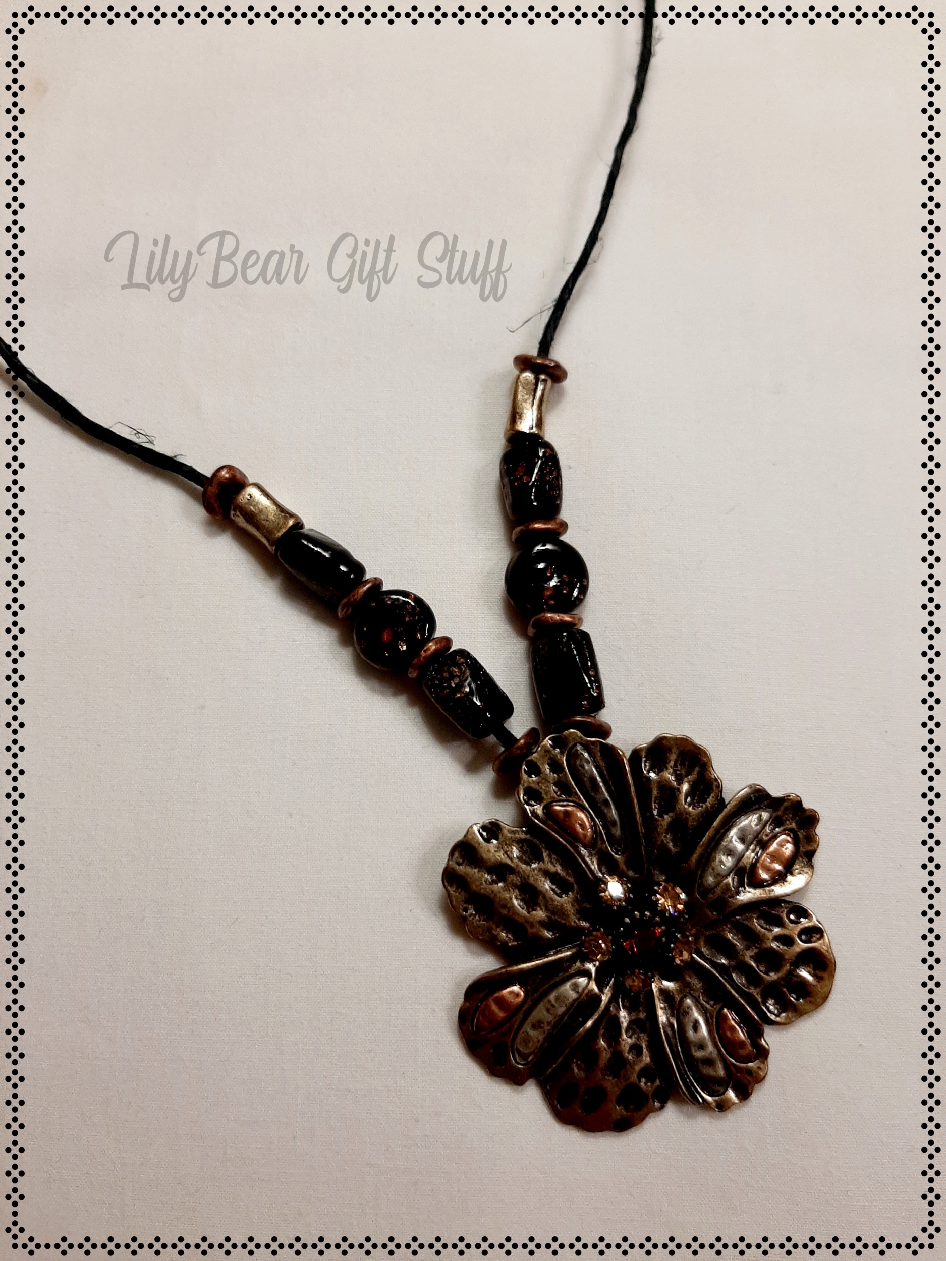 A cute and simple Necklace made with a gorgeous Bronze flower and bronze and gold beads.