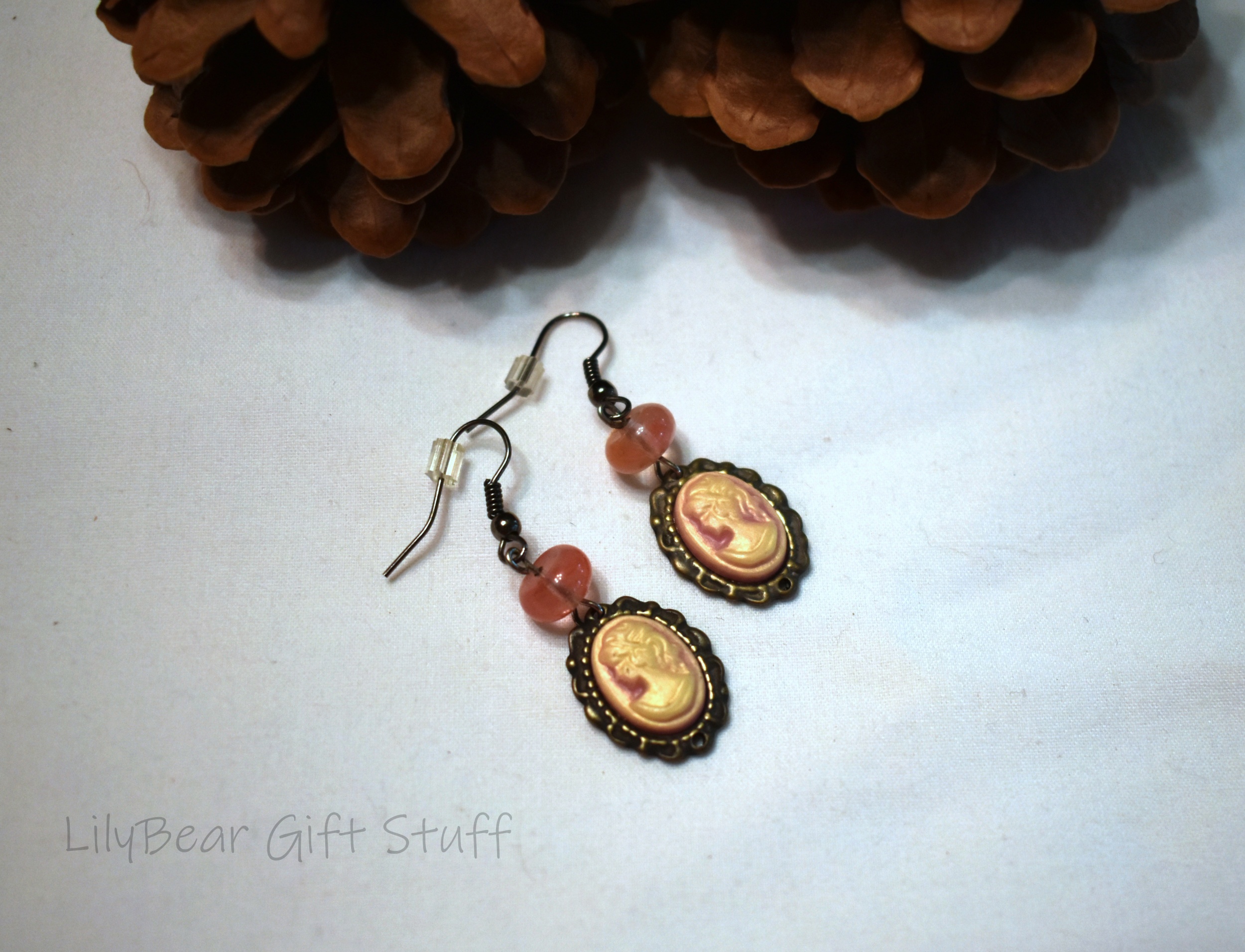 Cute and simple earrings made with pretty peach cameos and peach glass beads.