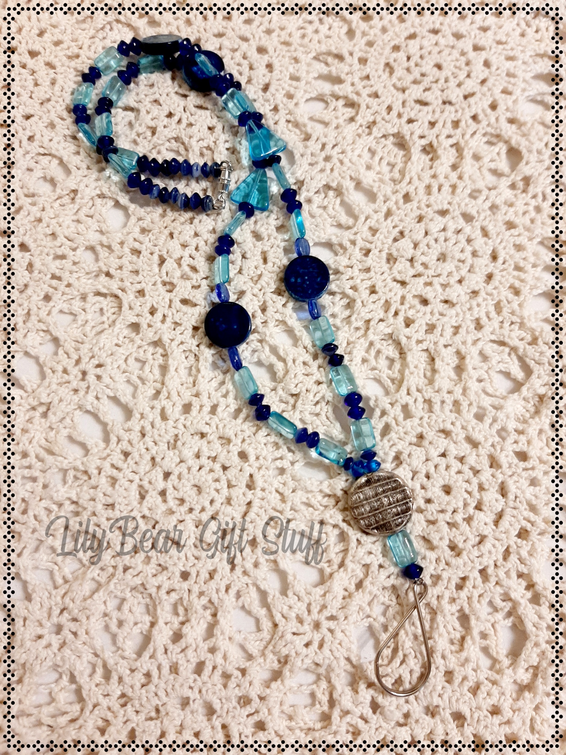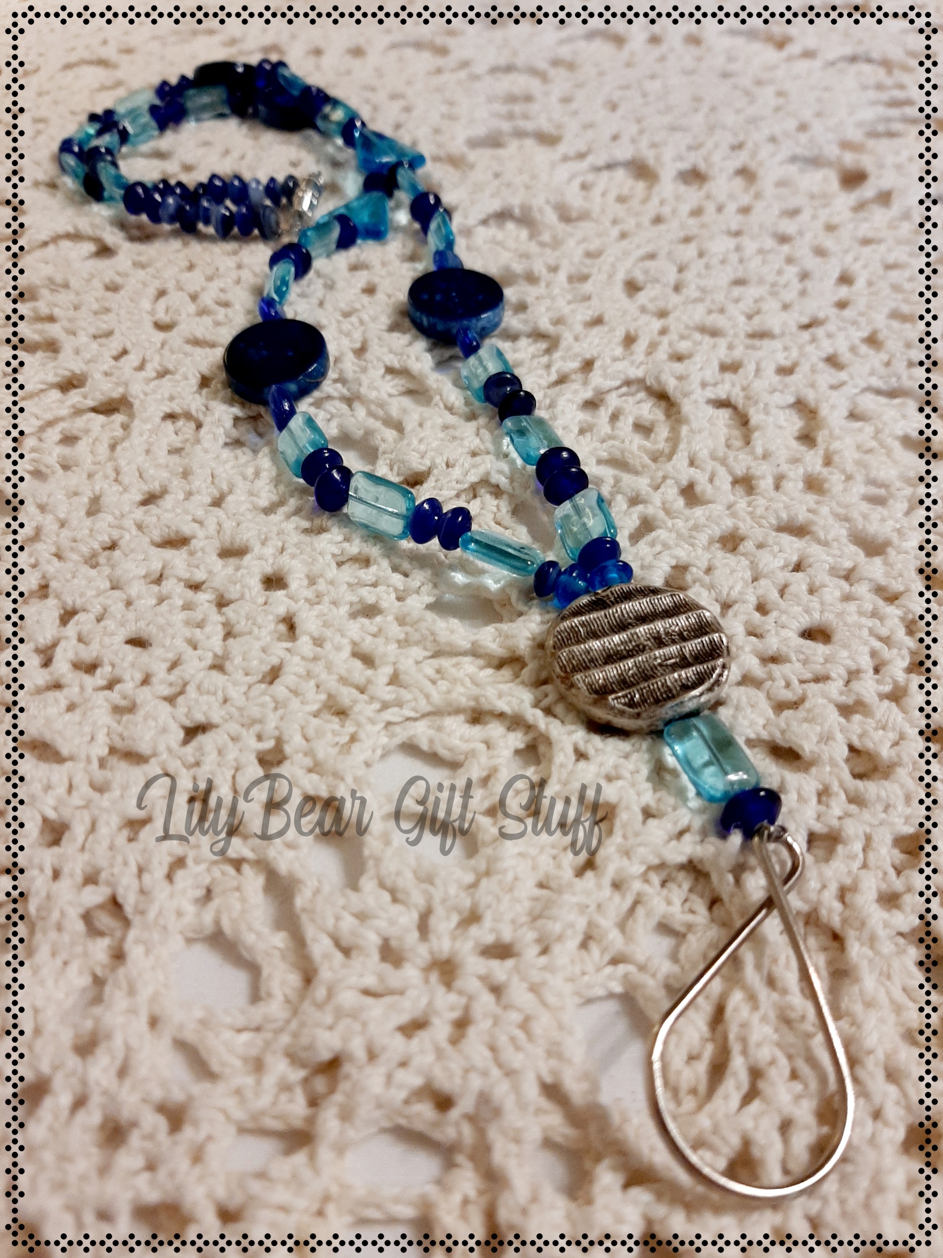 A cute and simple Lanyard made with different shades and shades of blue glass and acrylic beads!