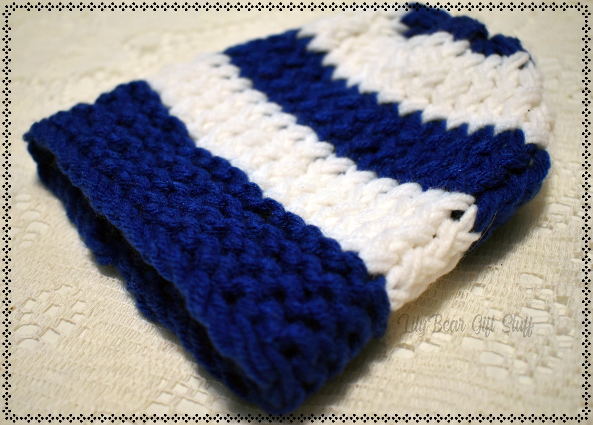 Blue and White Stripe Newborn Winter Hat, Loom Knit