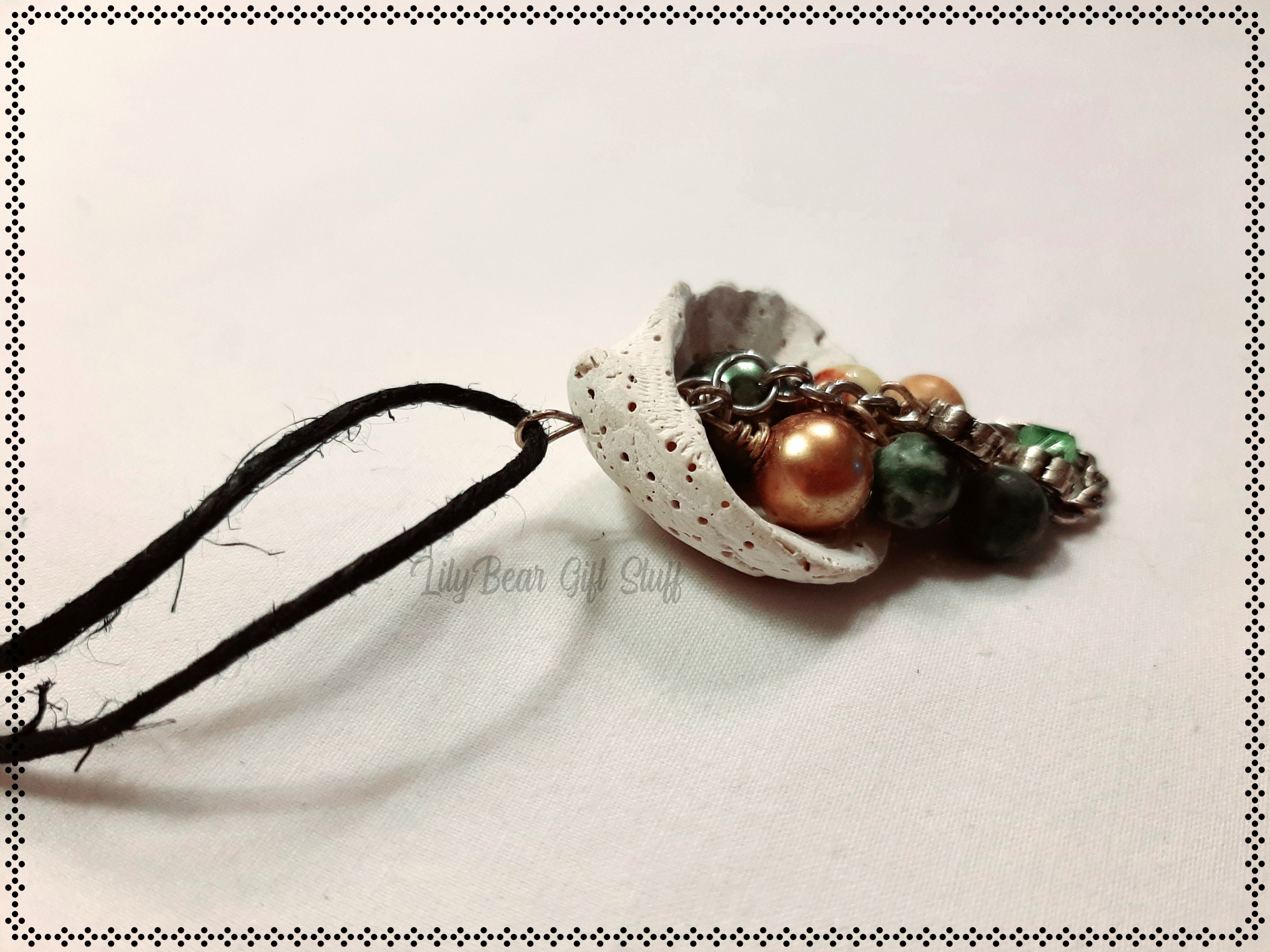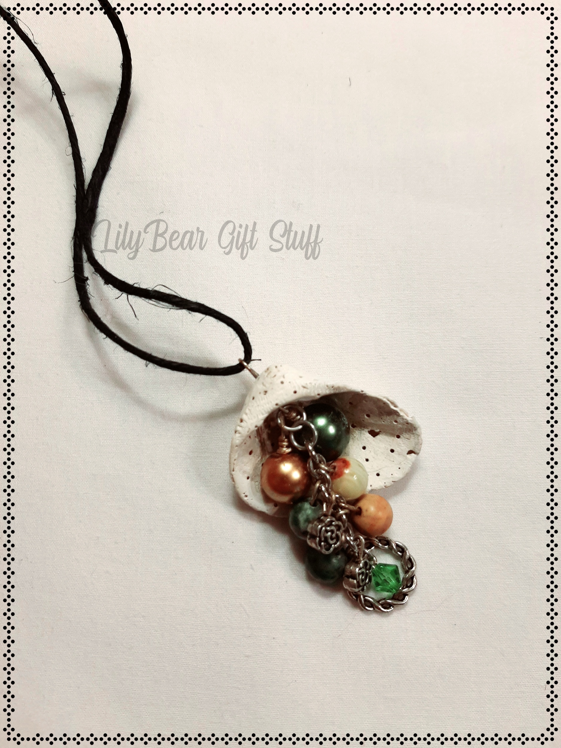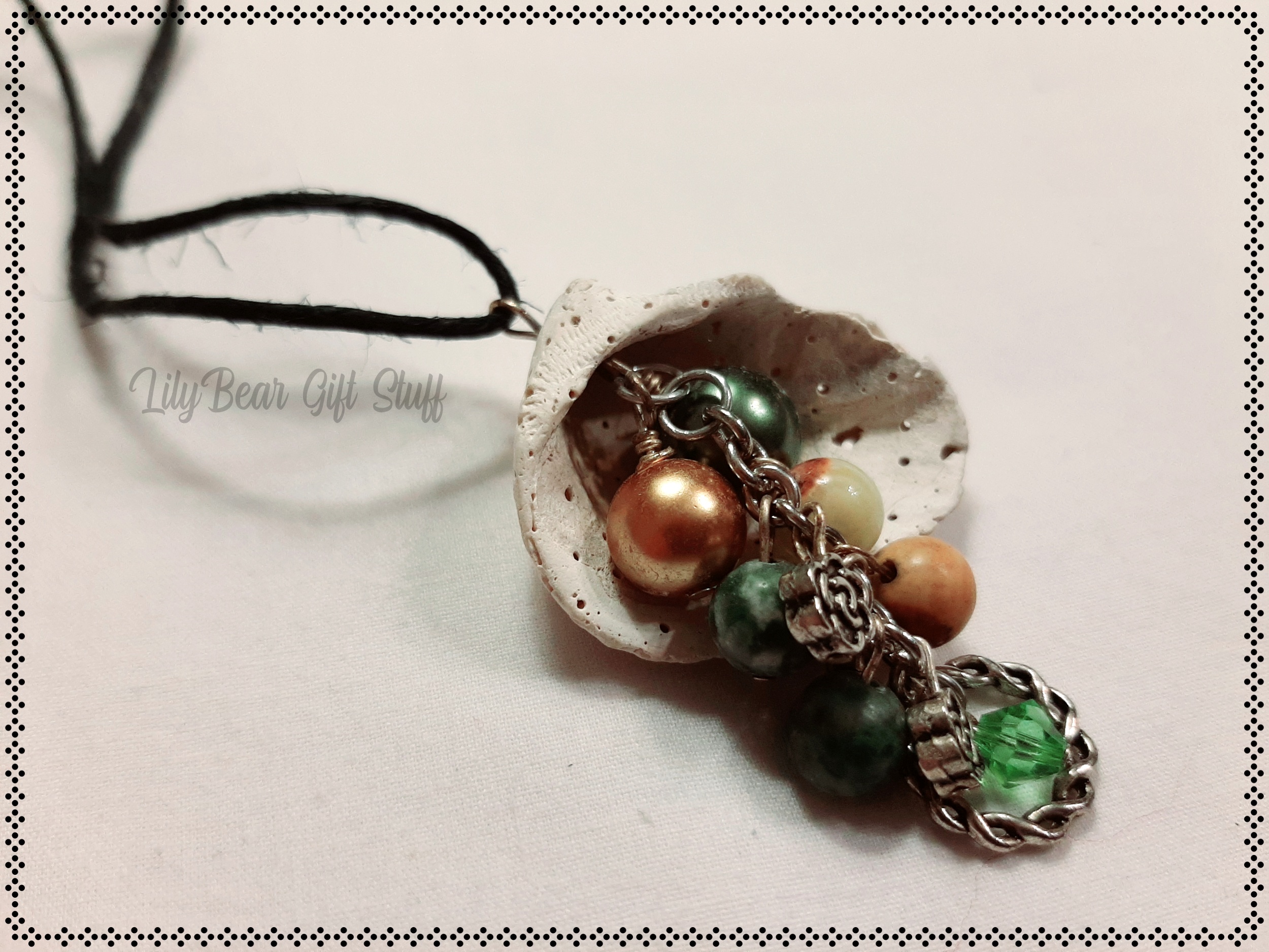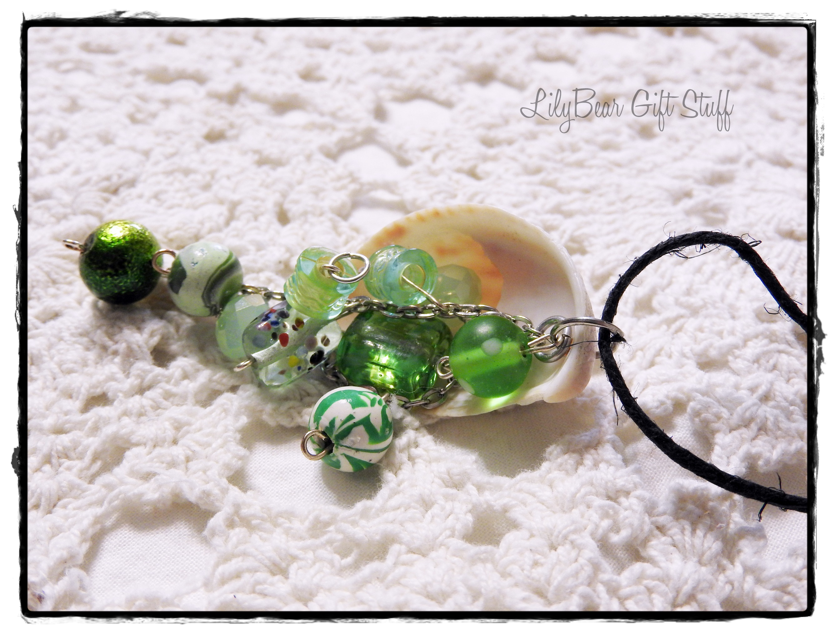 A cute and simple Necklace made with different green beads and a cute little sea shell.
