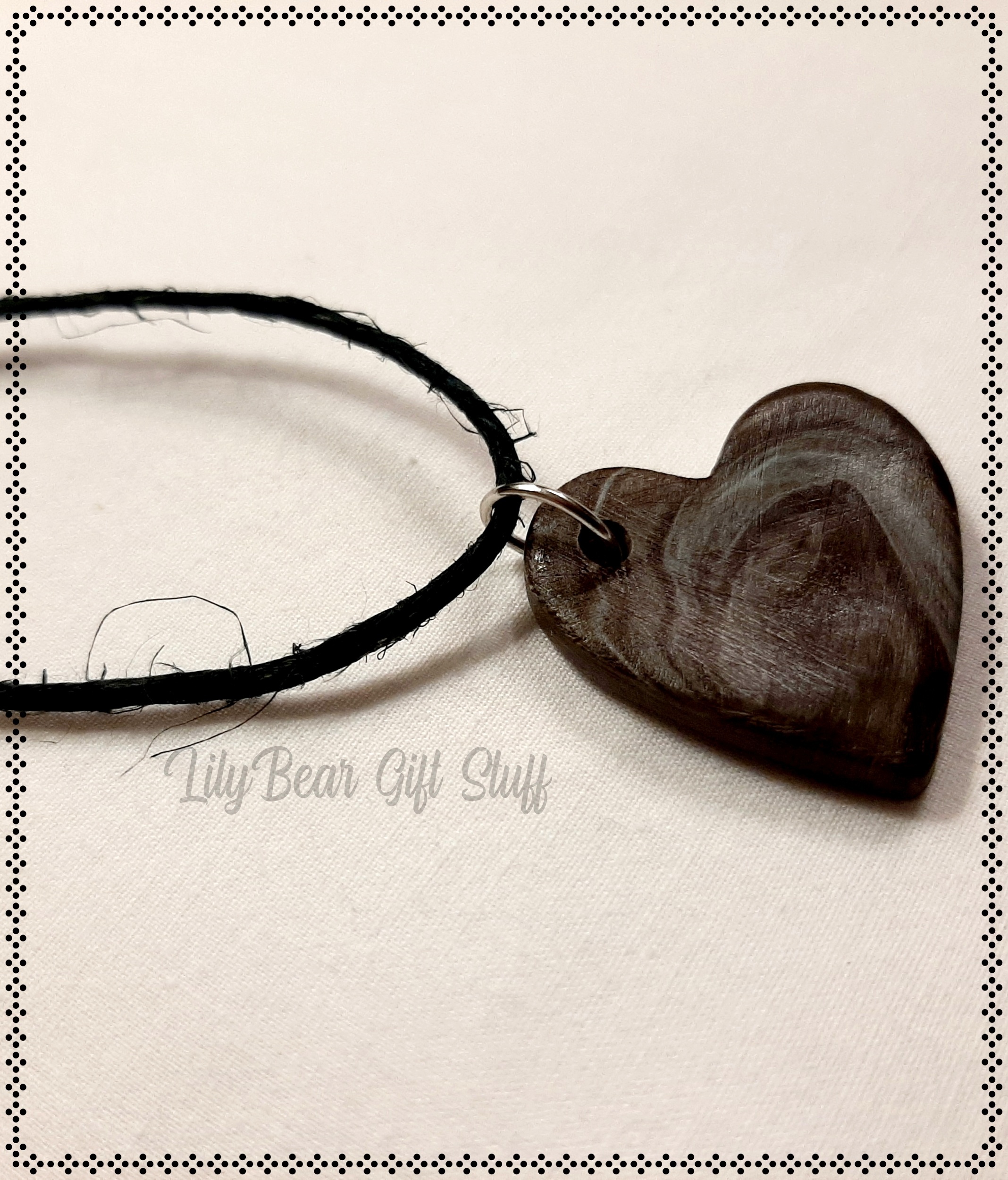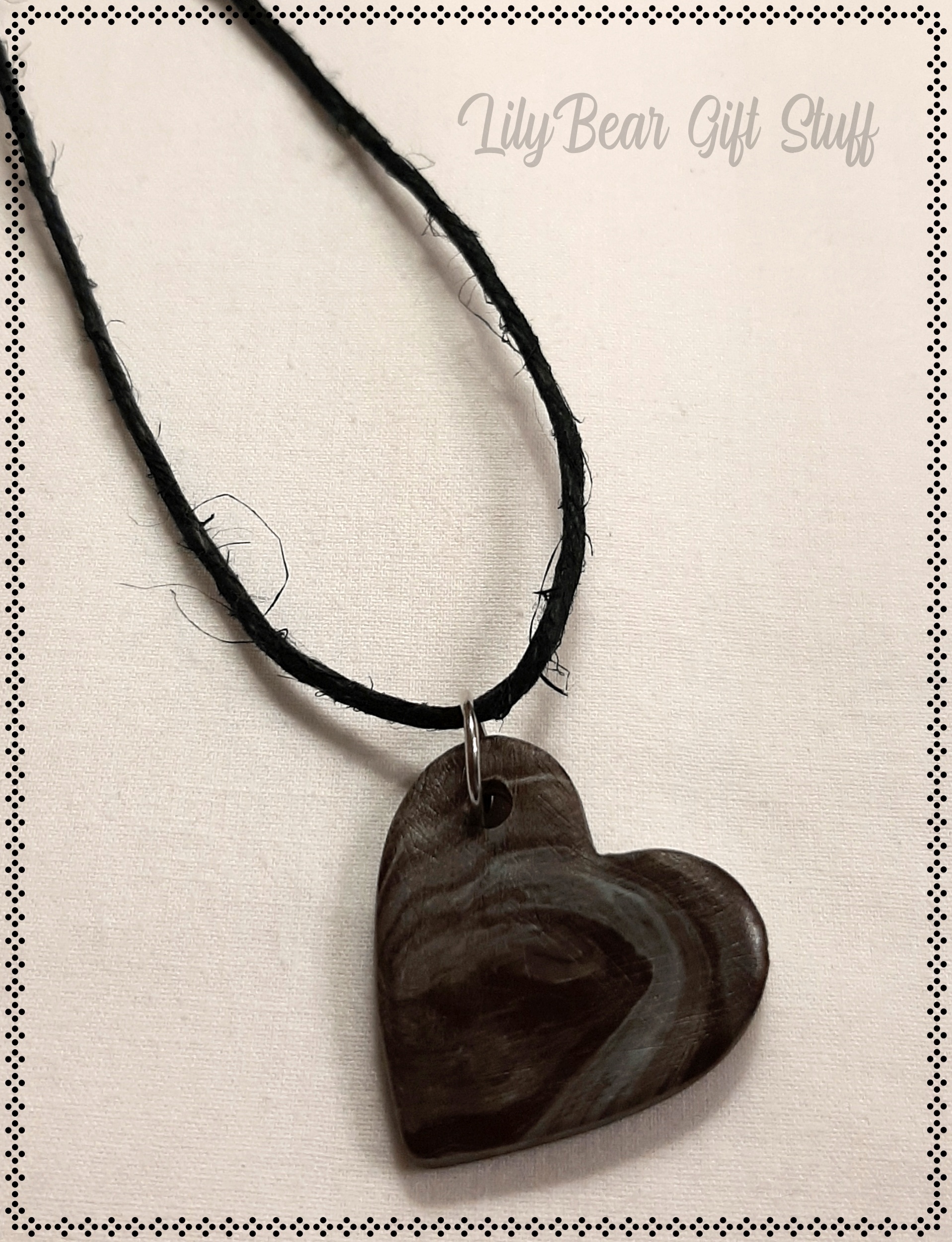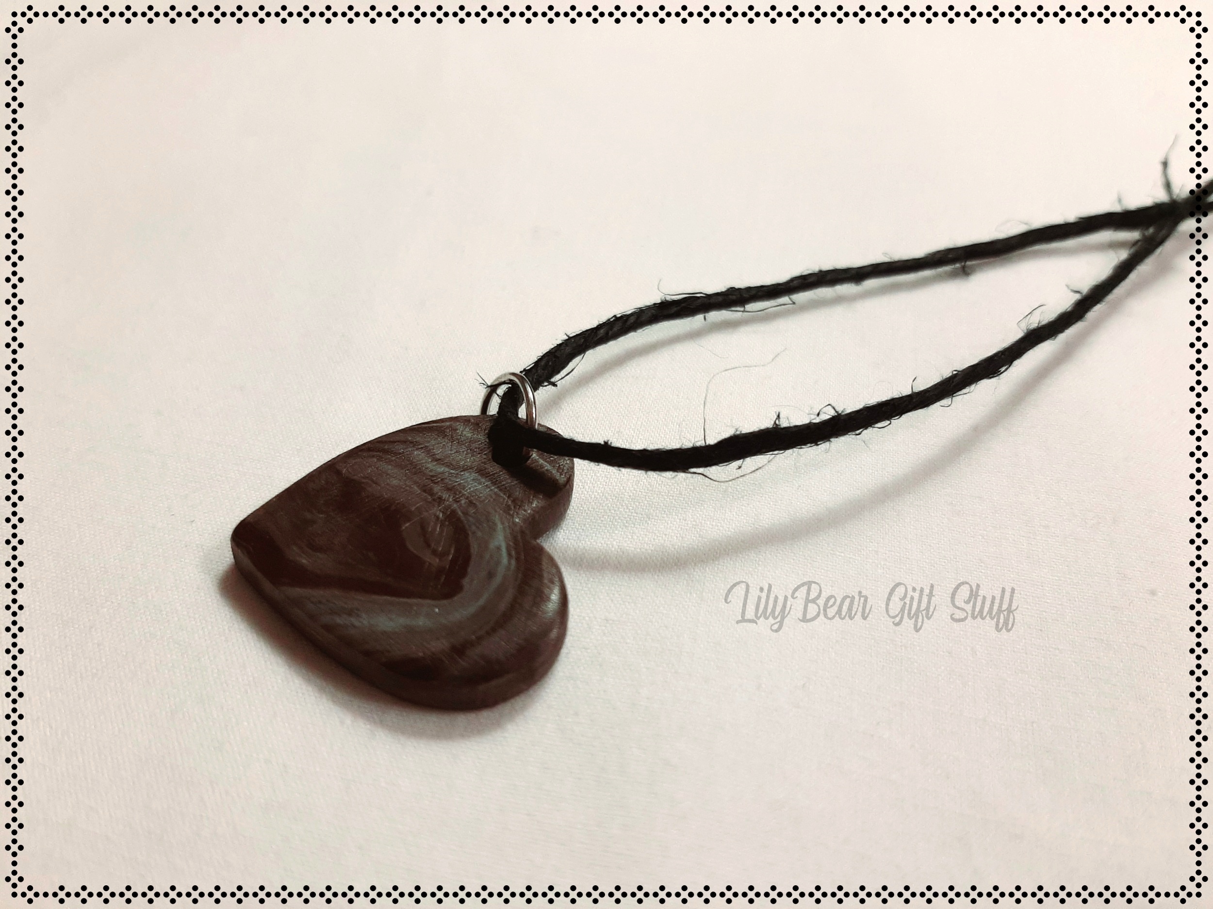 A cute and simple Necklace made with a brown and gray mix, polymer clay heart, made to look old, and a black cord!