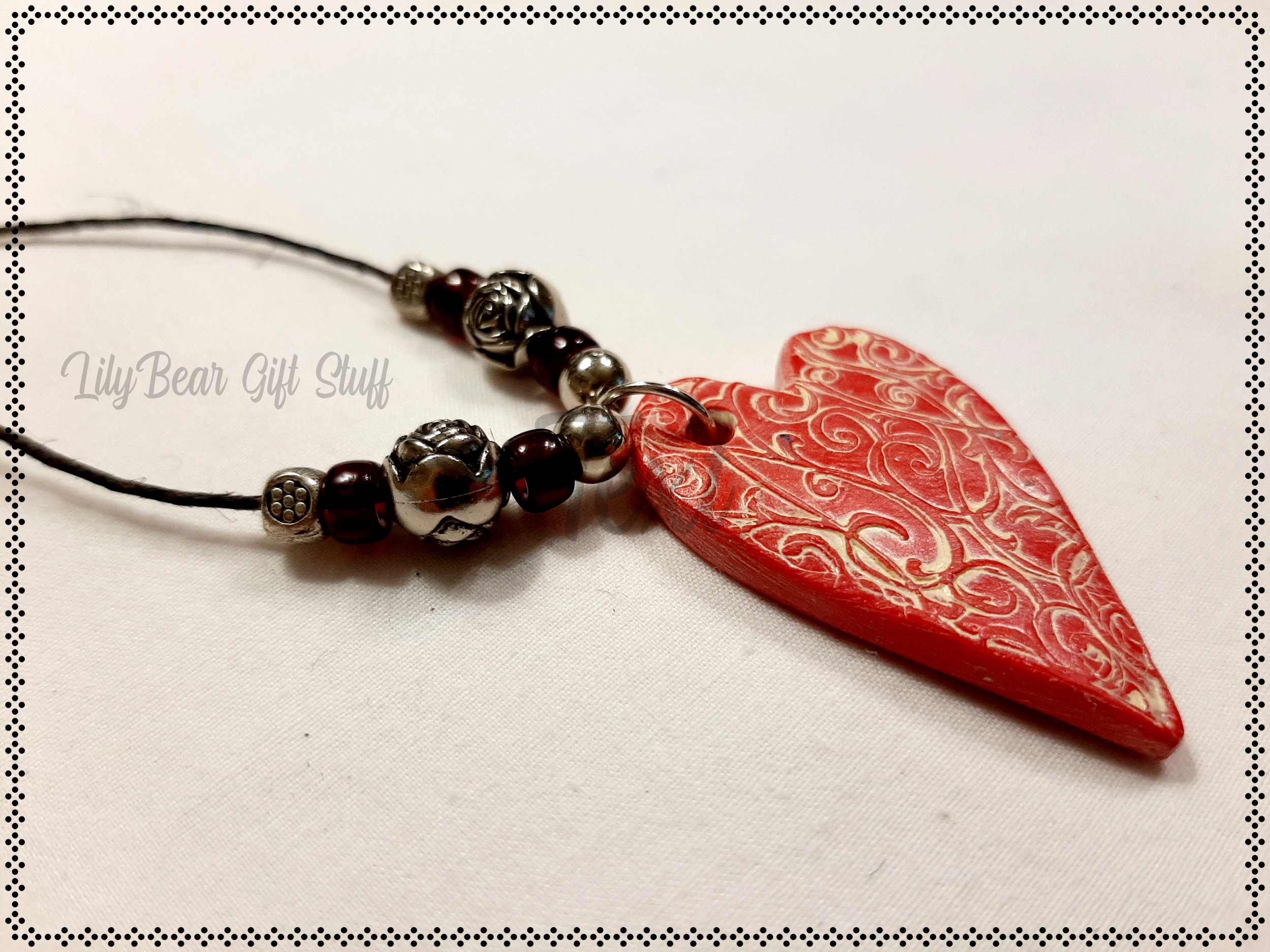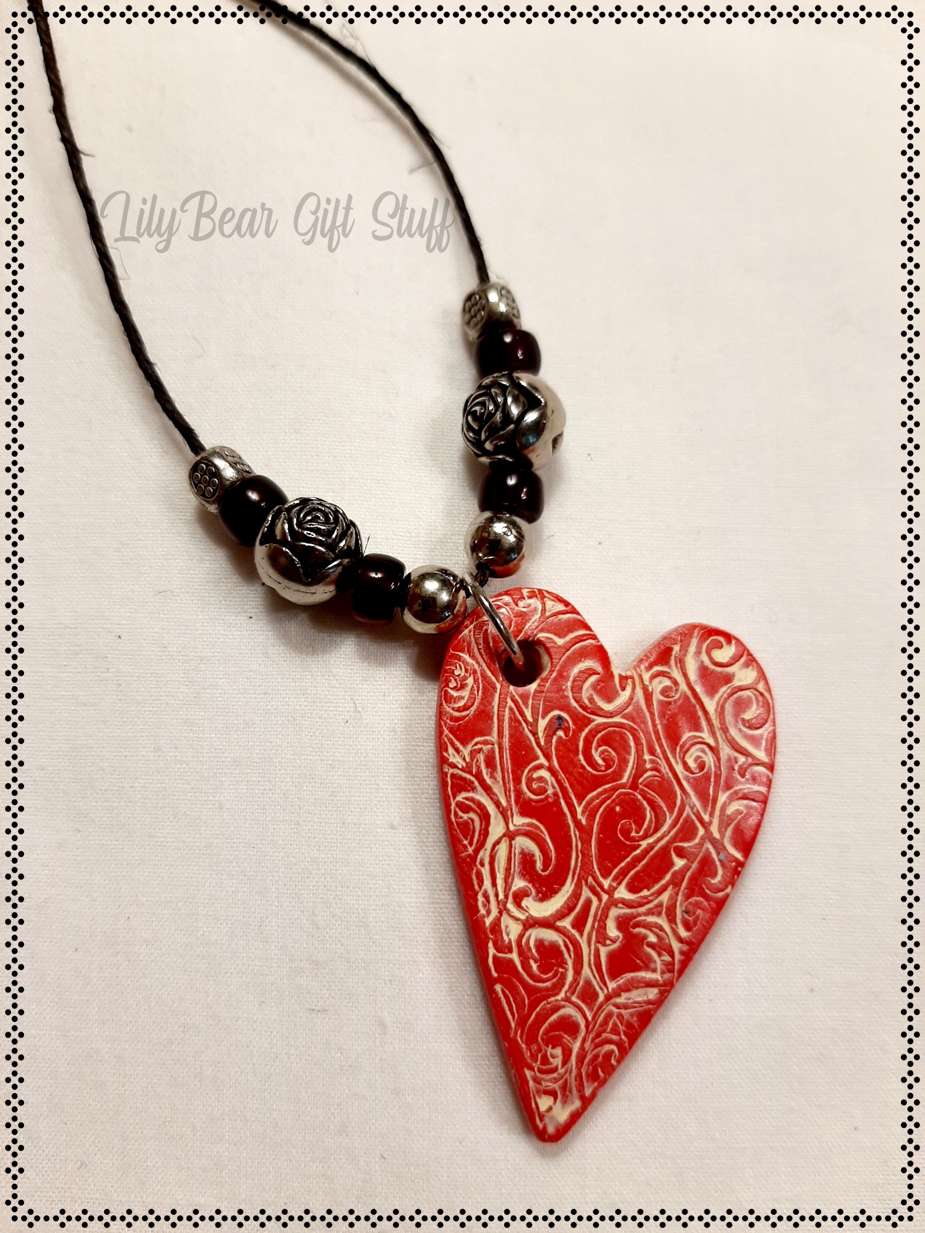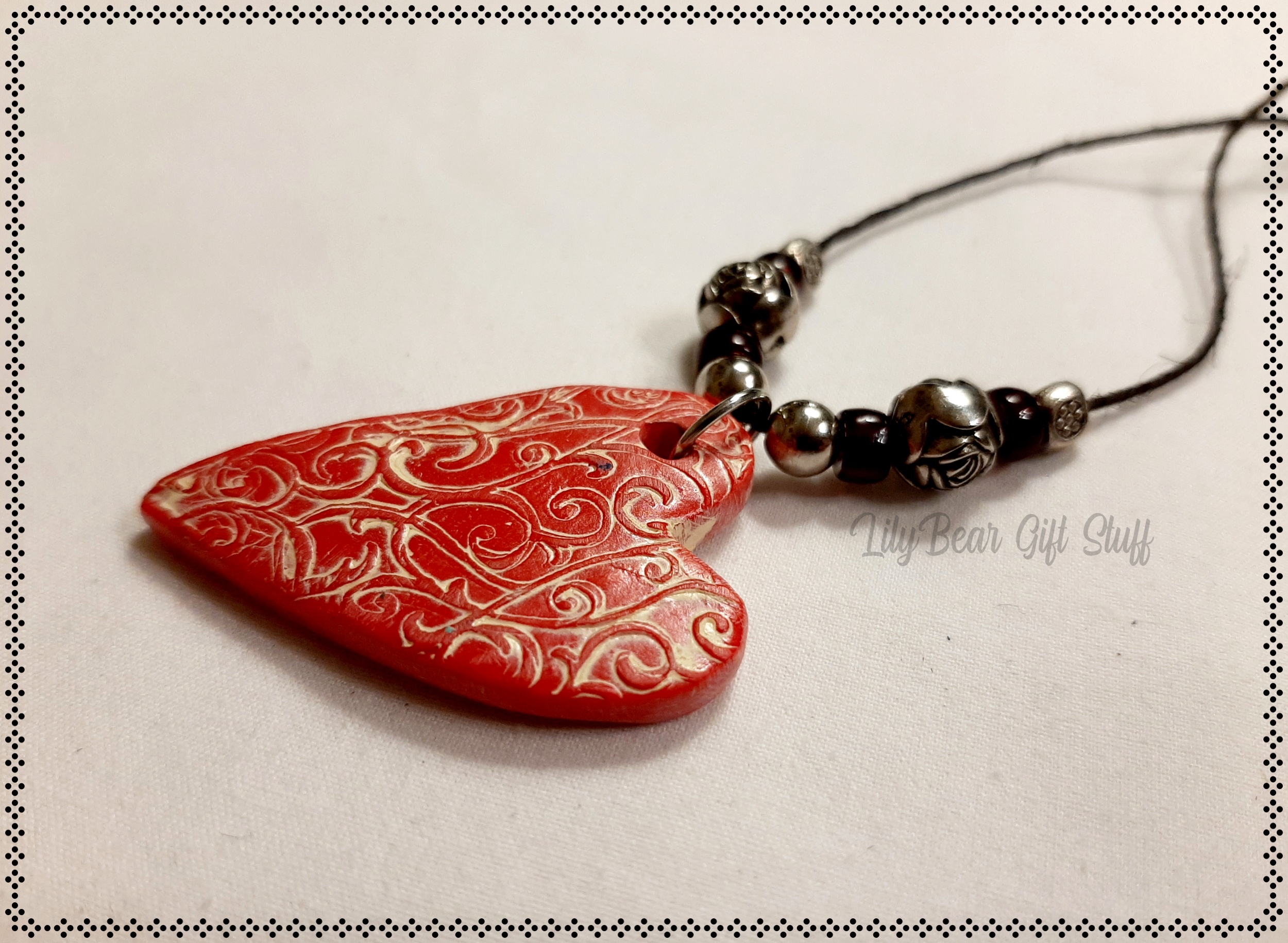 A cute and simple Necklace made with red polymer clay and shaped into a heart with a lace design!