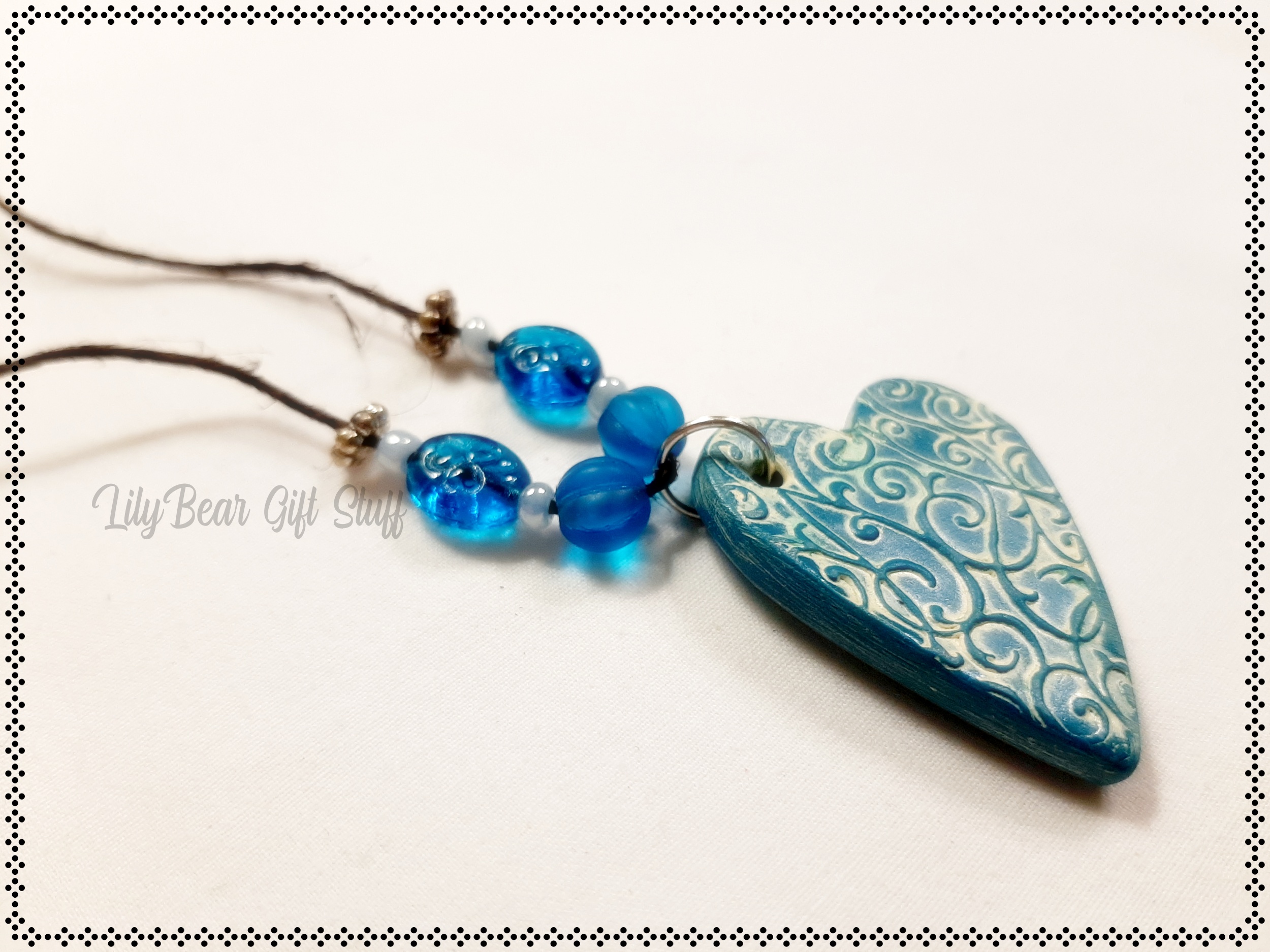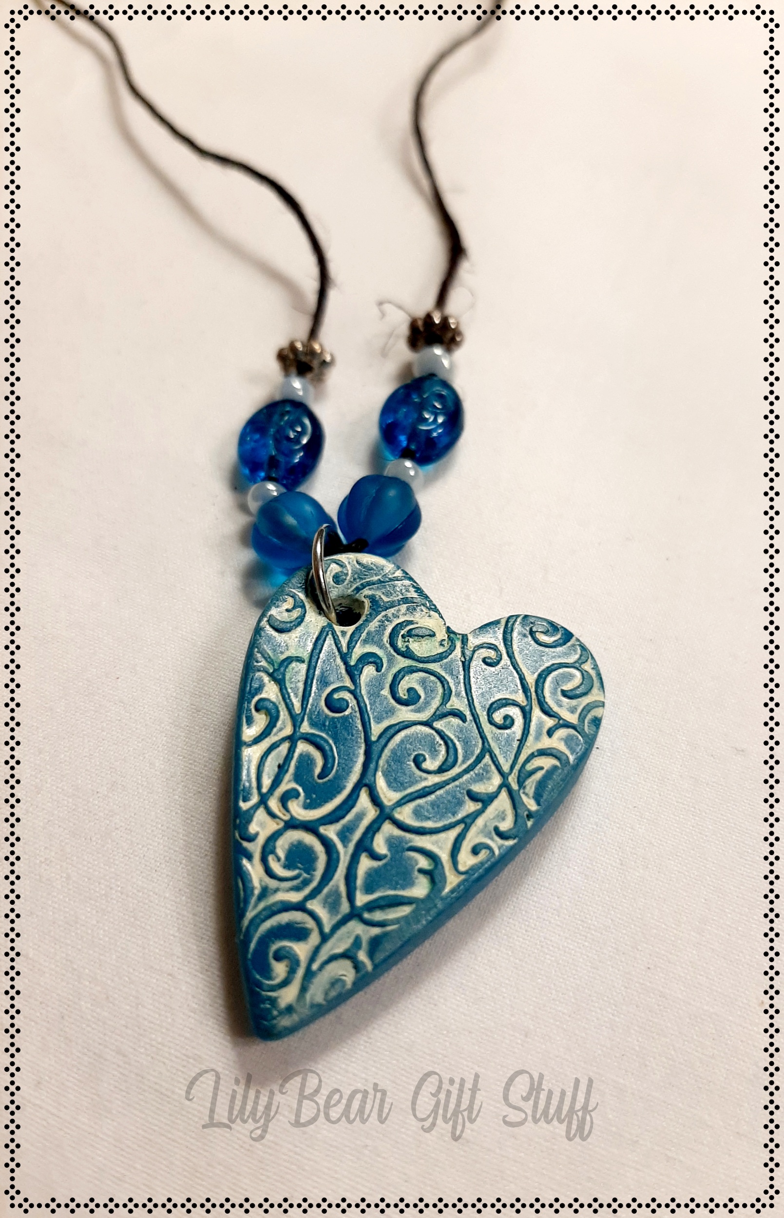 A cute and simple Necklace made with blue polymer clay and shaped into a heart with a lace design!