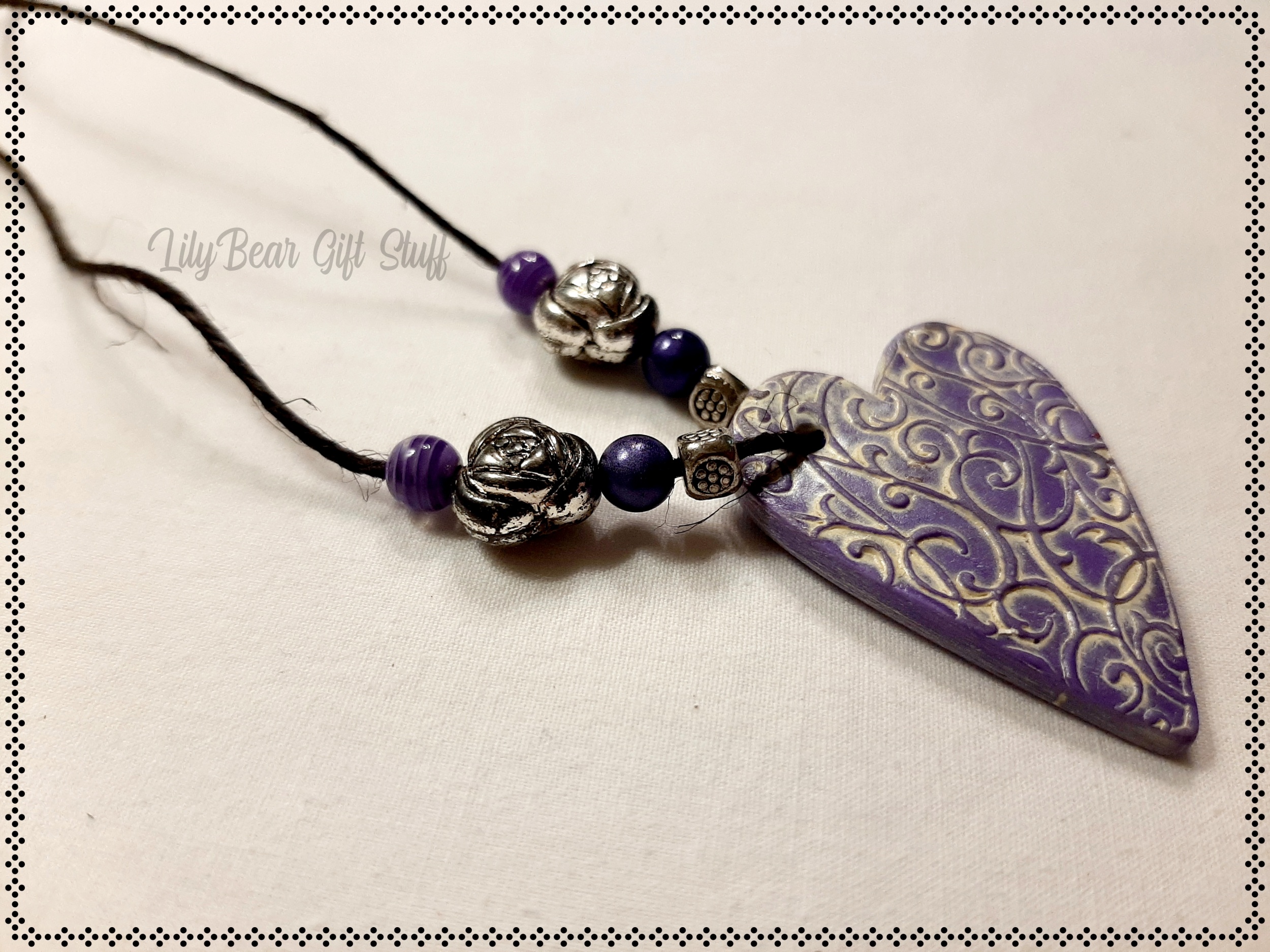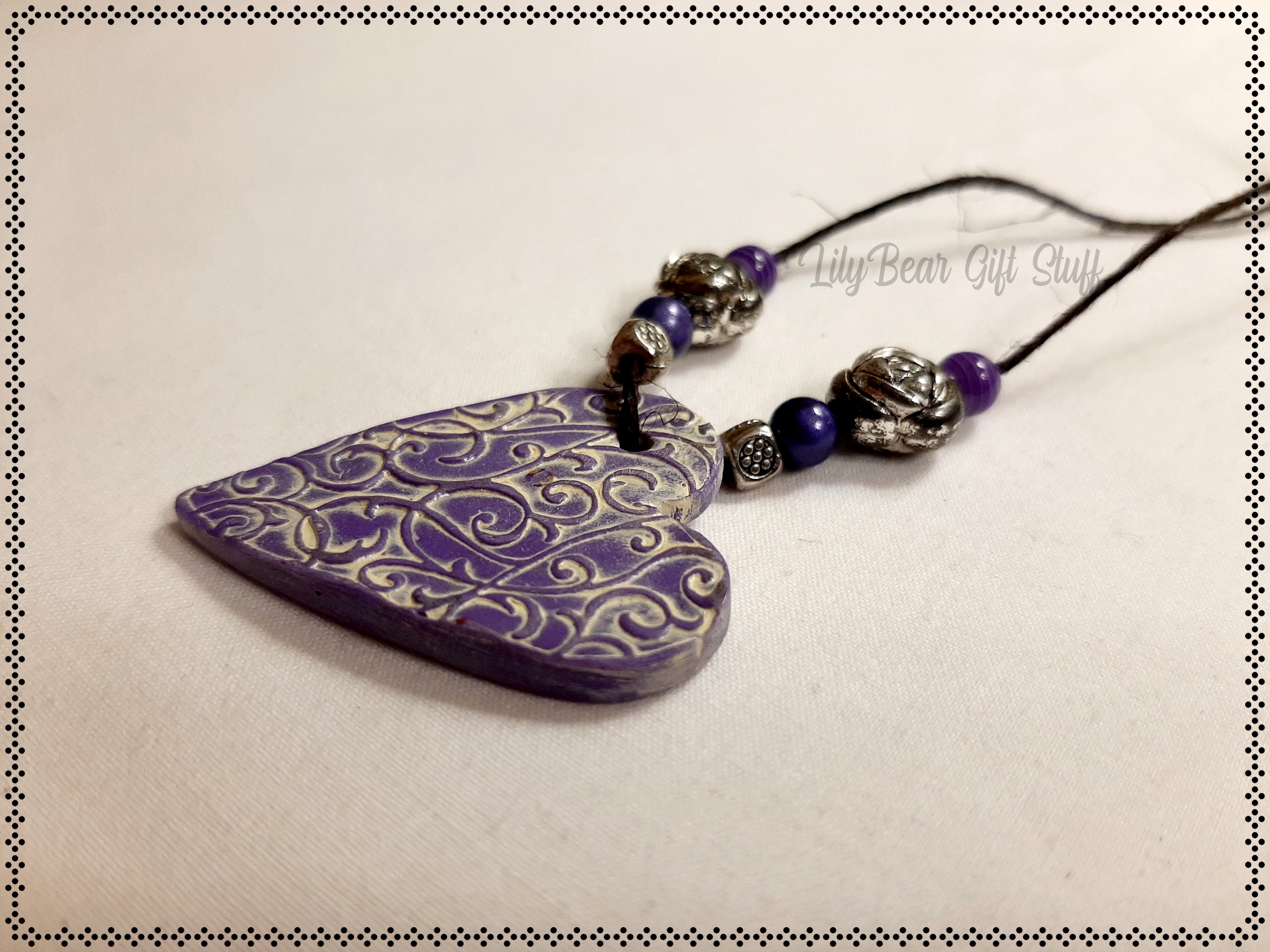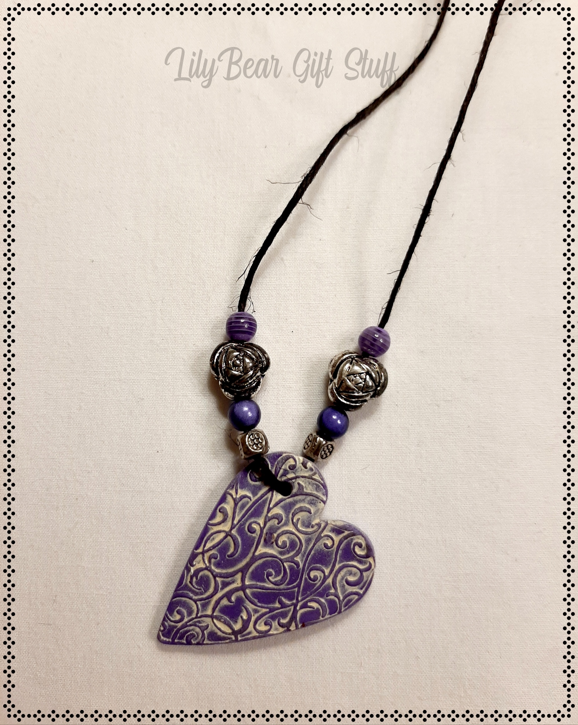 A cute and simple Necklace made with purple polymer clay and shaped into a heart with a lace design!