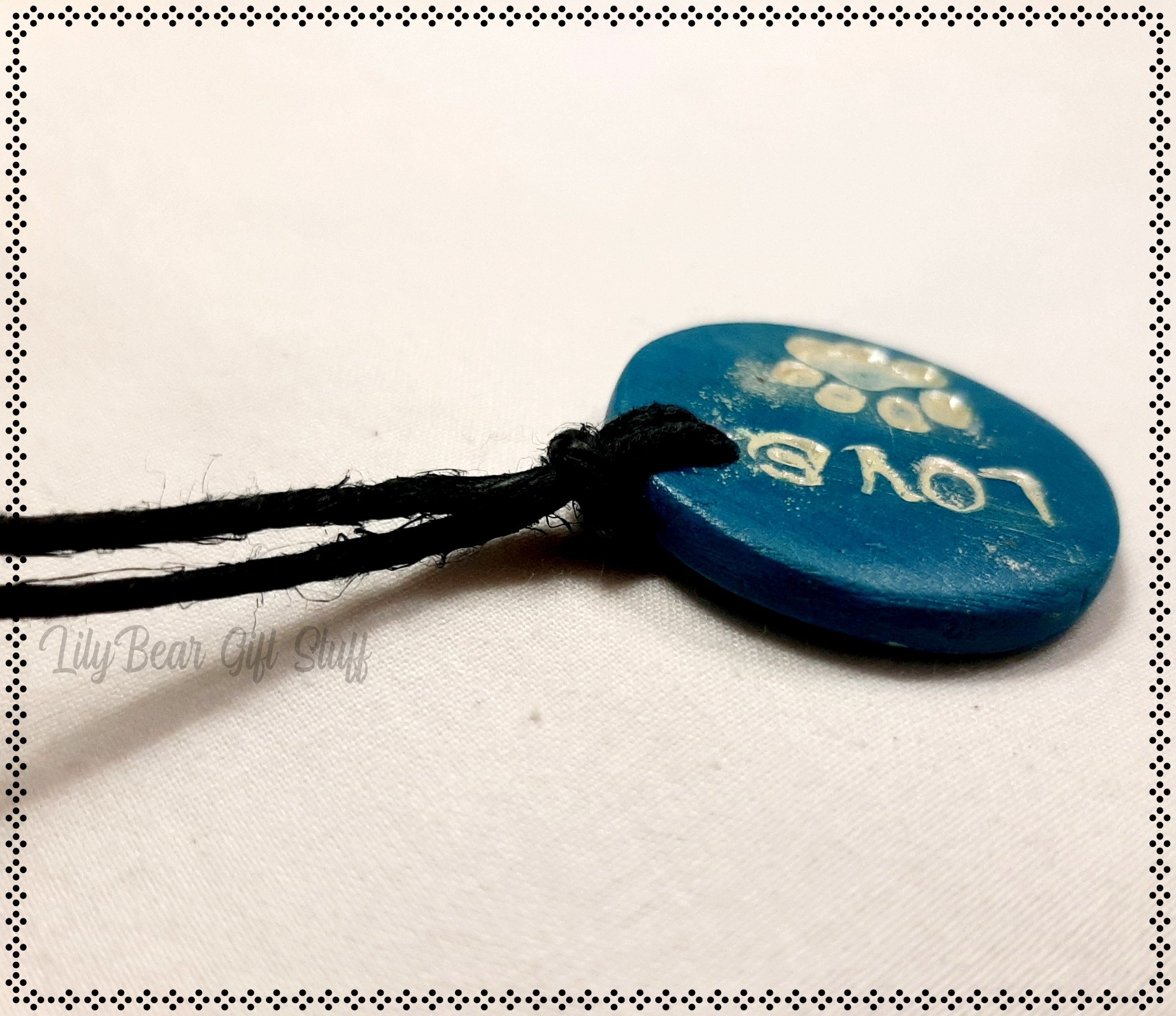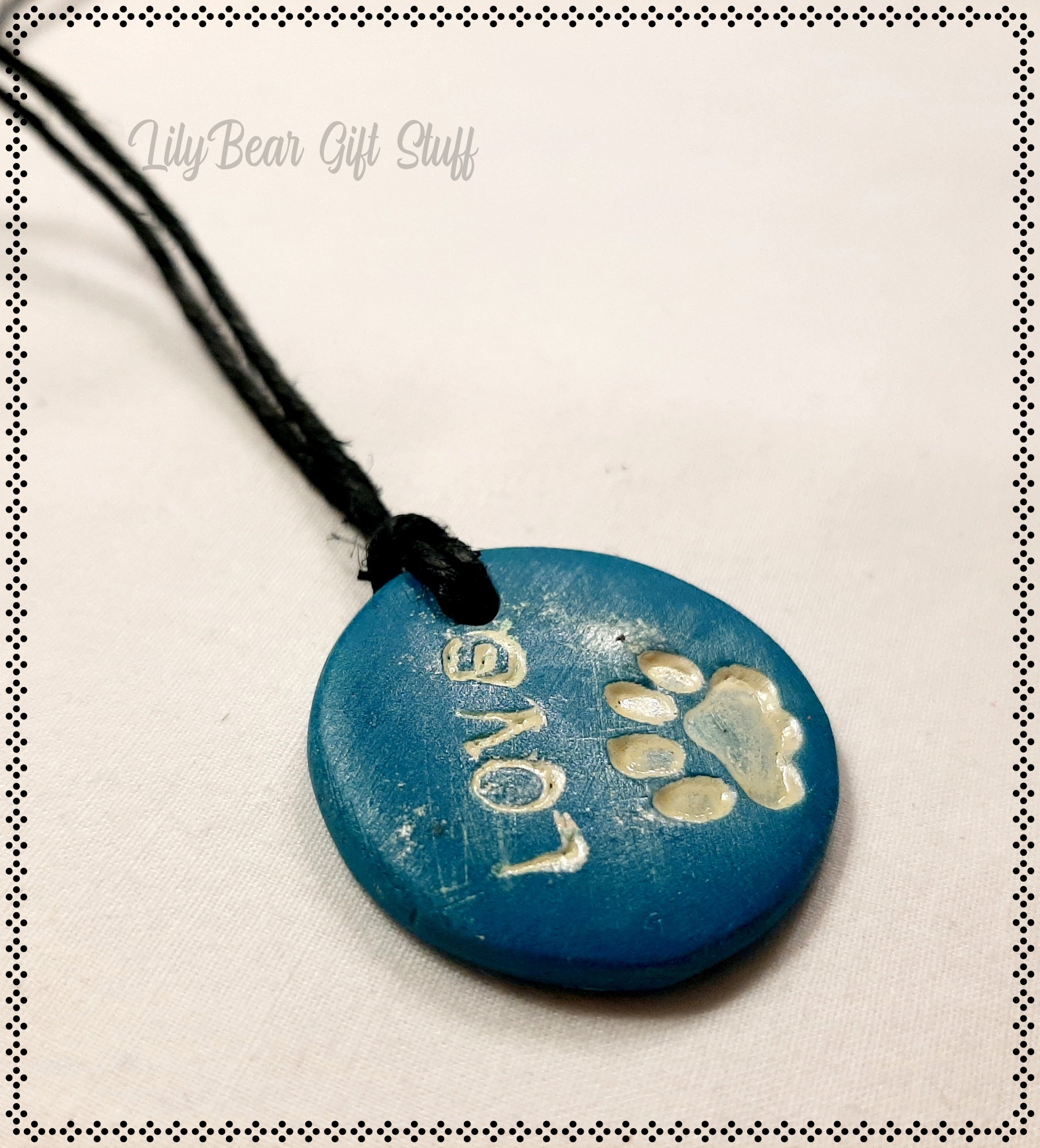 A cute and simple Necklace made with blue polymer clay, with Love and a paw print on it.