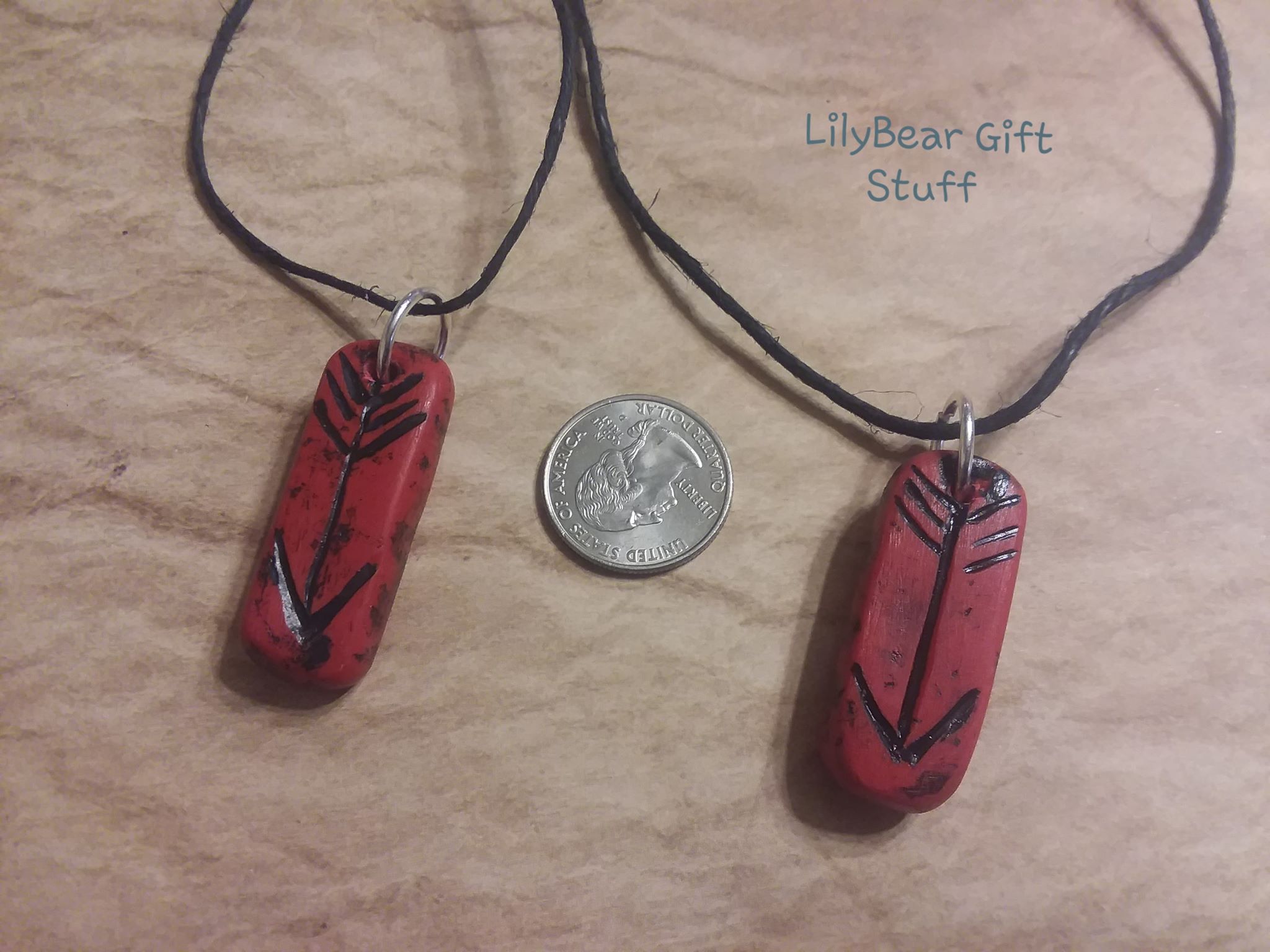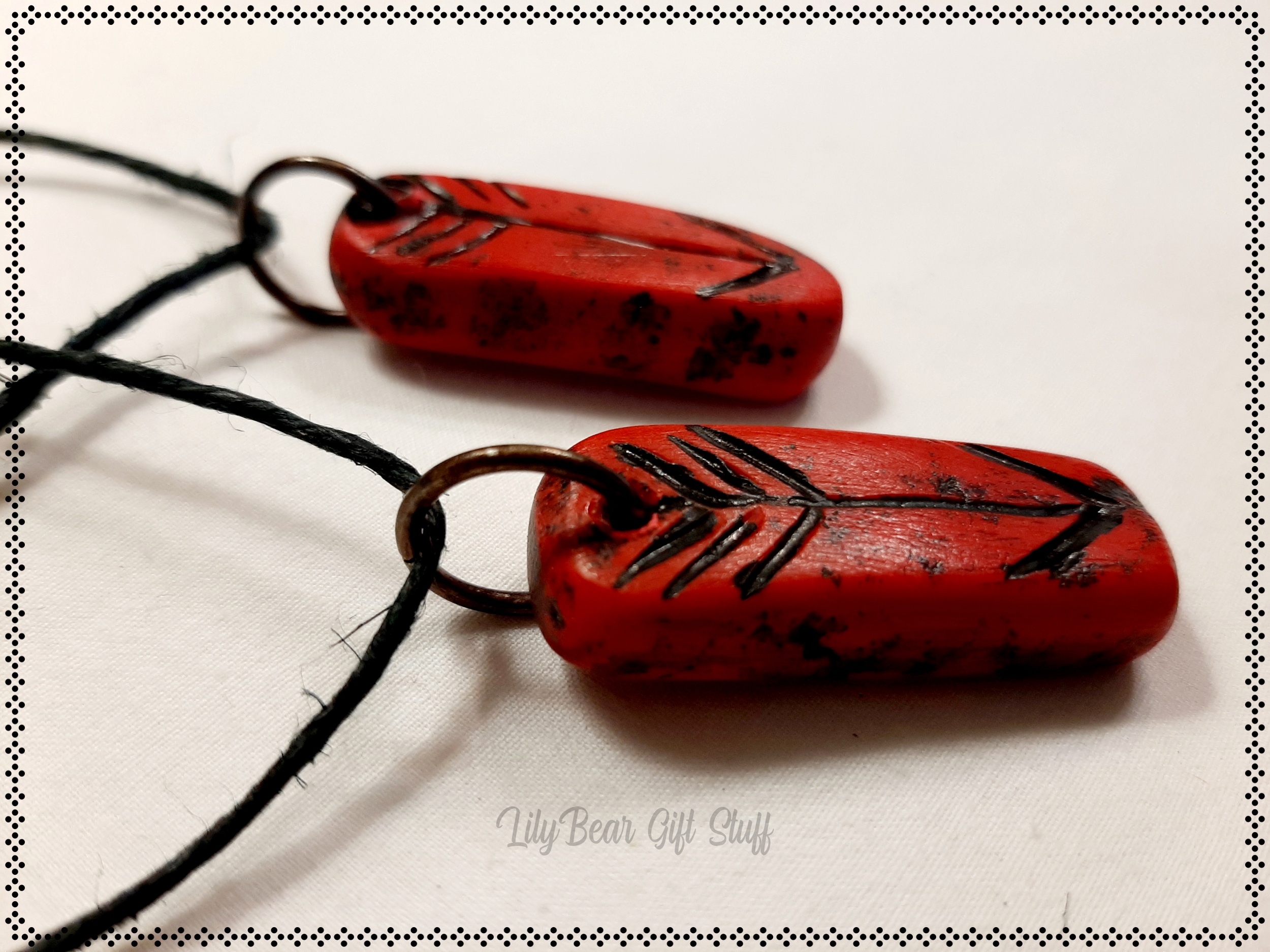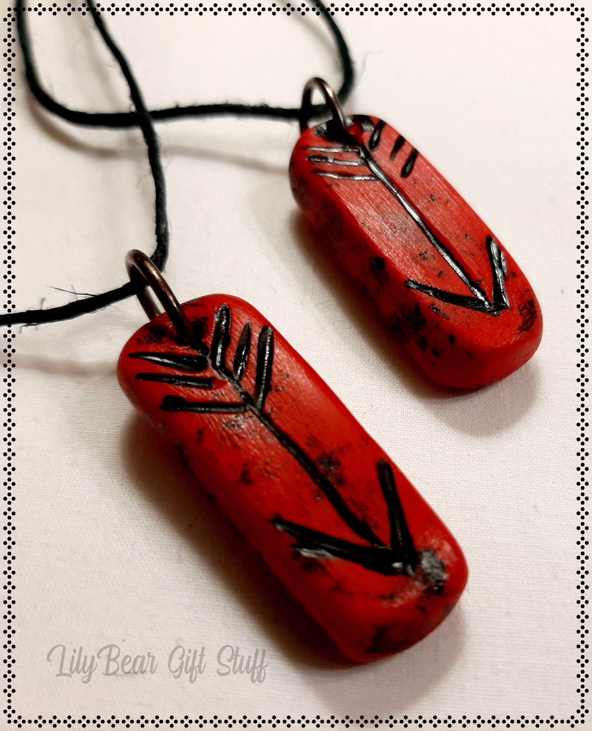 A cute and simple Necklace made with red polymer clay and an arrow etched into it! Its made to look old.