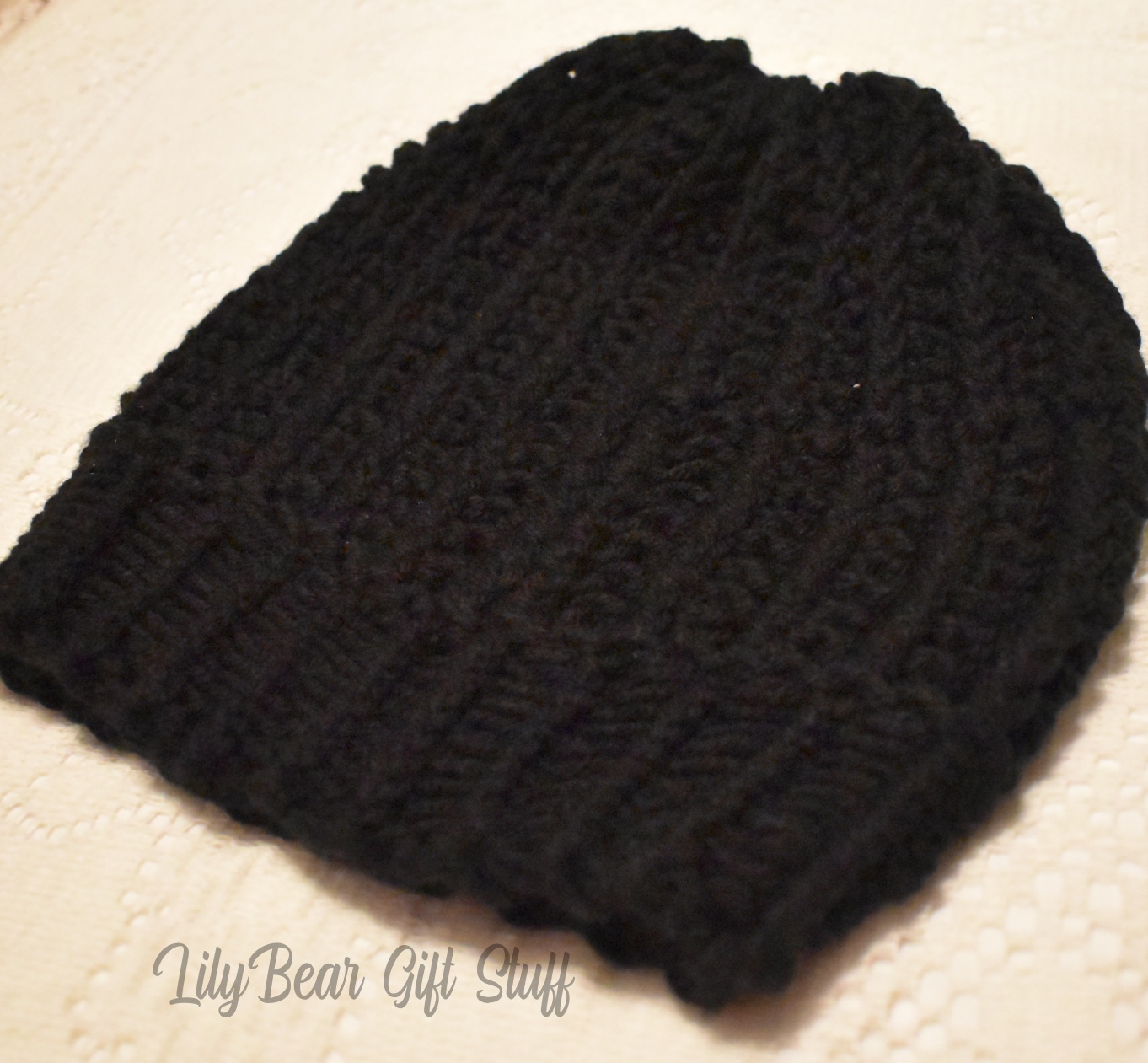 Very comfy and warm, this loom knit hat is adult sized. It will keep your head cozy!