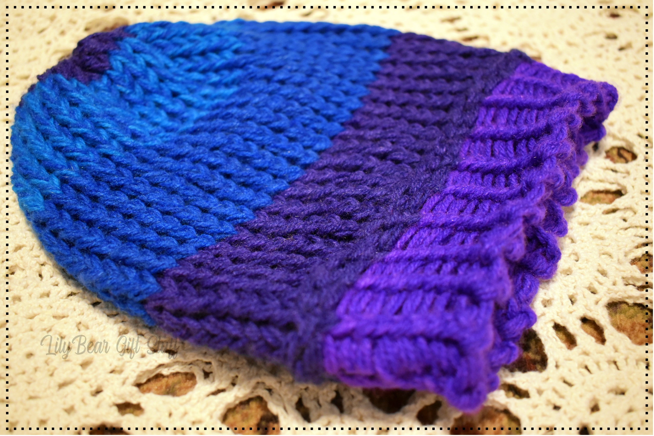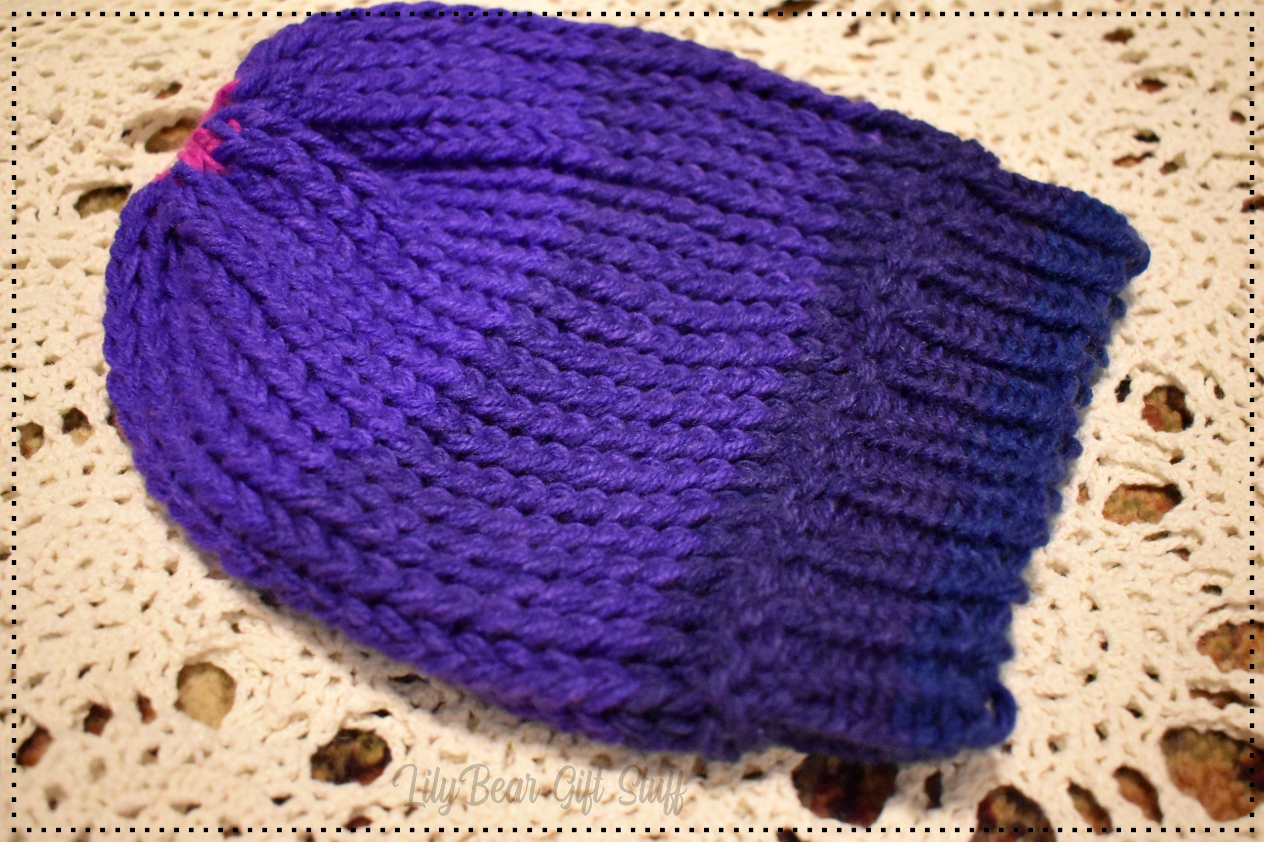 Very comfy and warm, this loom knit hat is adult sized. It will keep your head cozy!