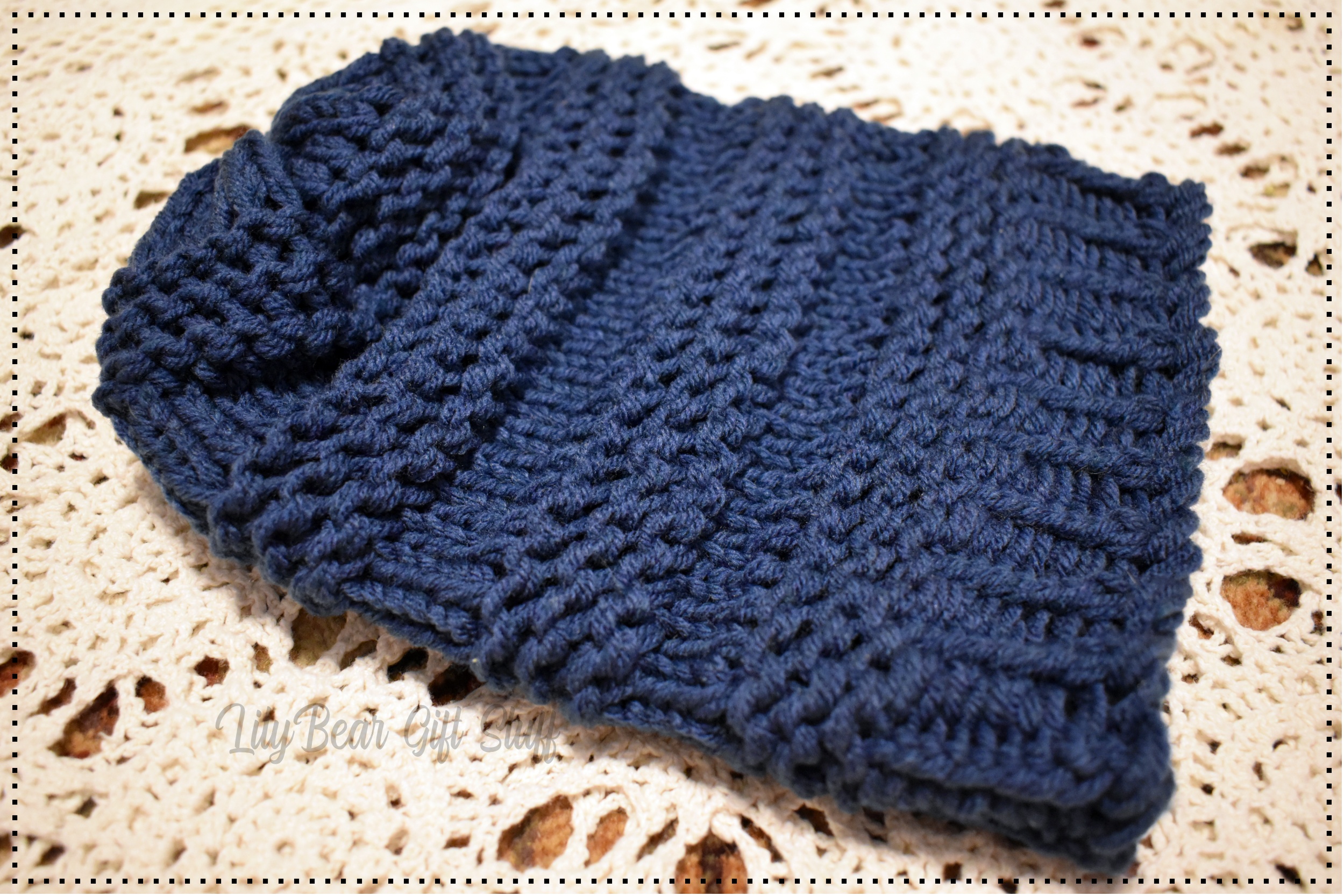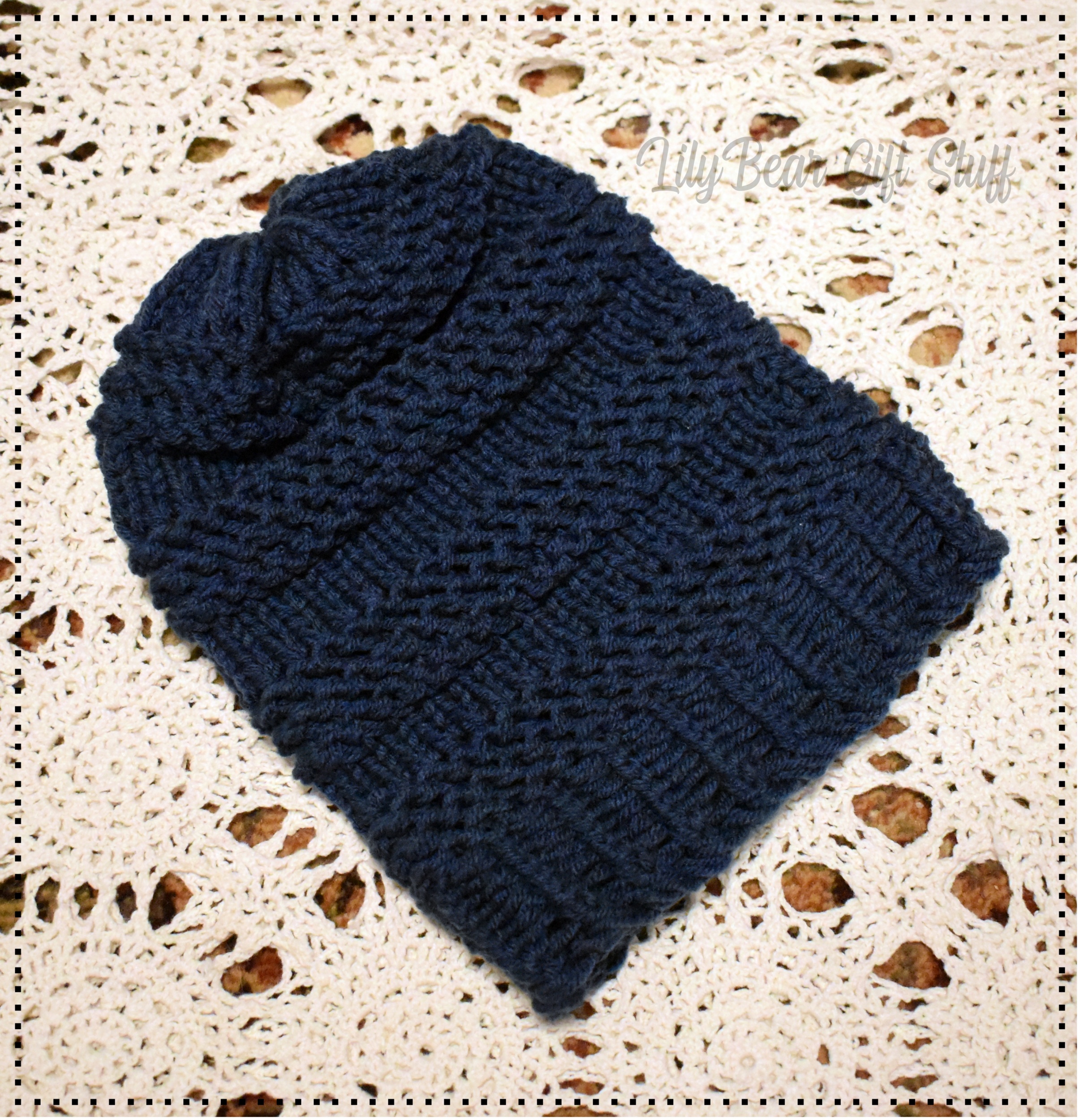 Very comfy and warm, this loom knit hat is adult sized. It will keep your head cozy!