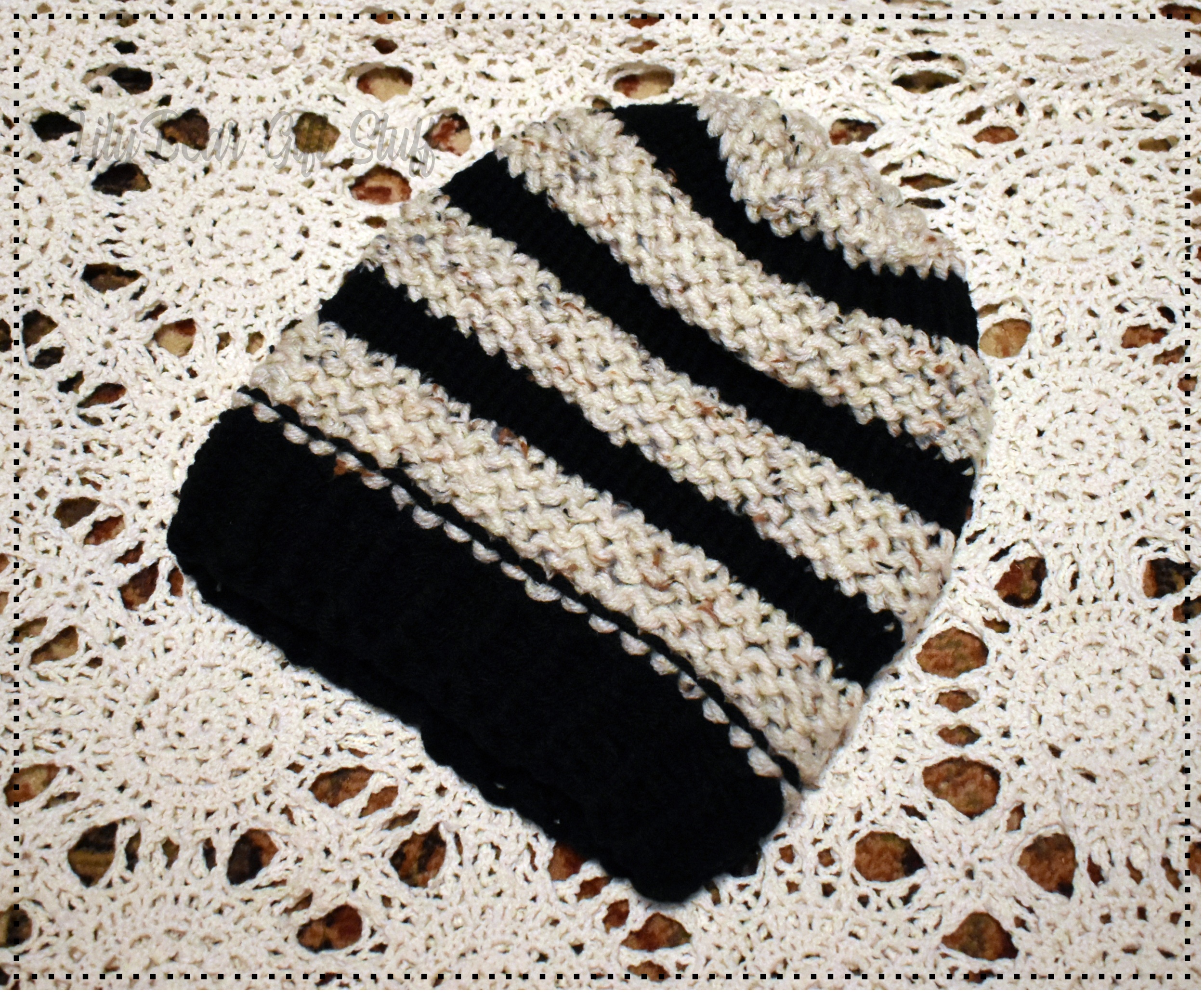 Very comfy and warm, this loom knit hat is adult sized. It will keep your head cozy!
