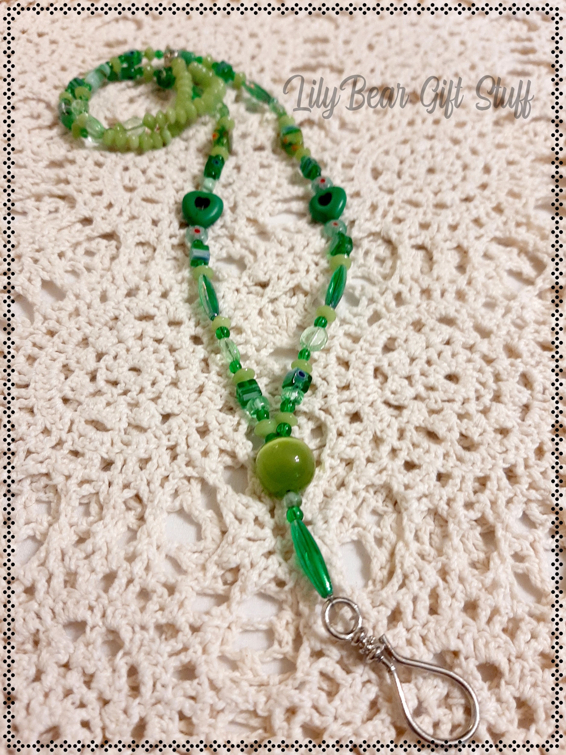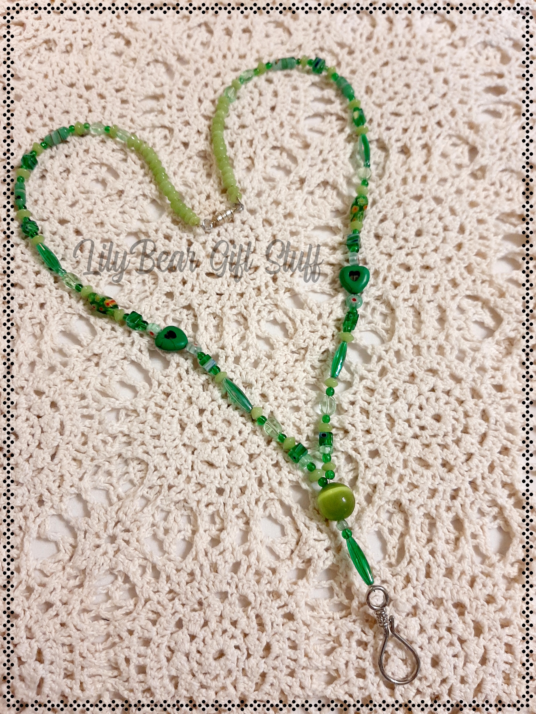 A cute and simple Lanyard made with different shades and shapes of green beads, along with cute little green hearts!