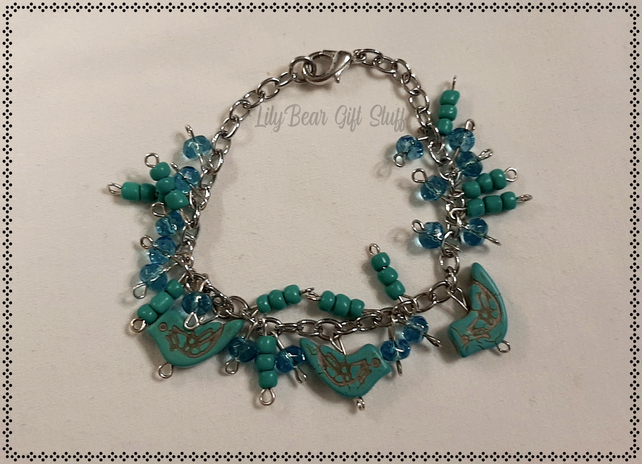 Made with blue bird charms and blue glass beads! Measures 7 1/2 inches and can be adjusted to whatever size!