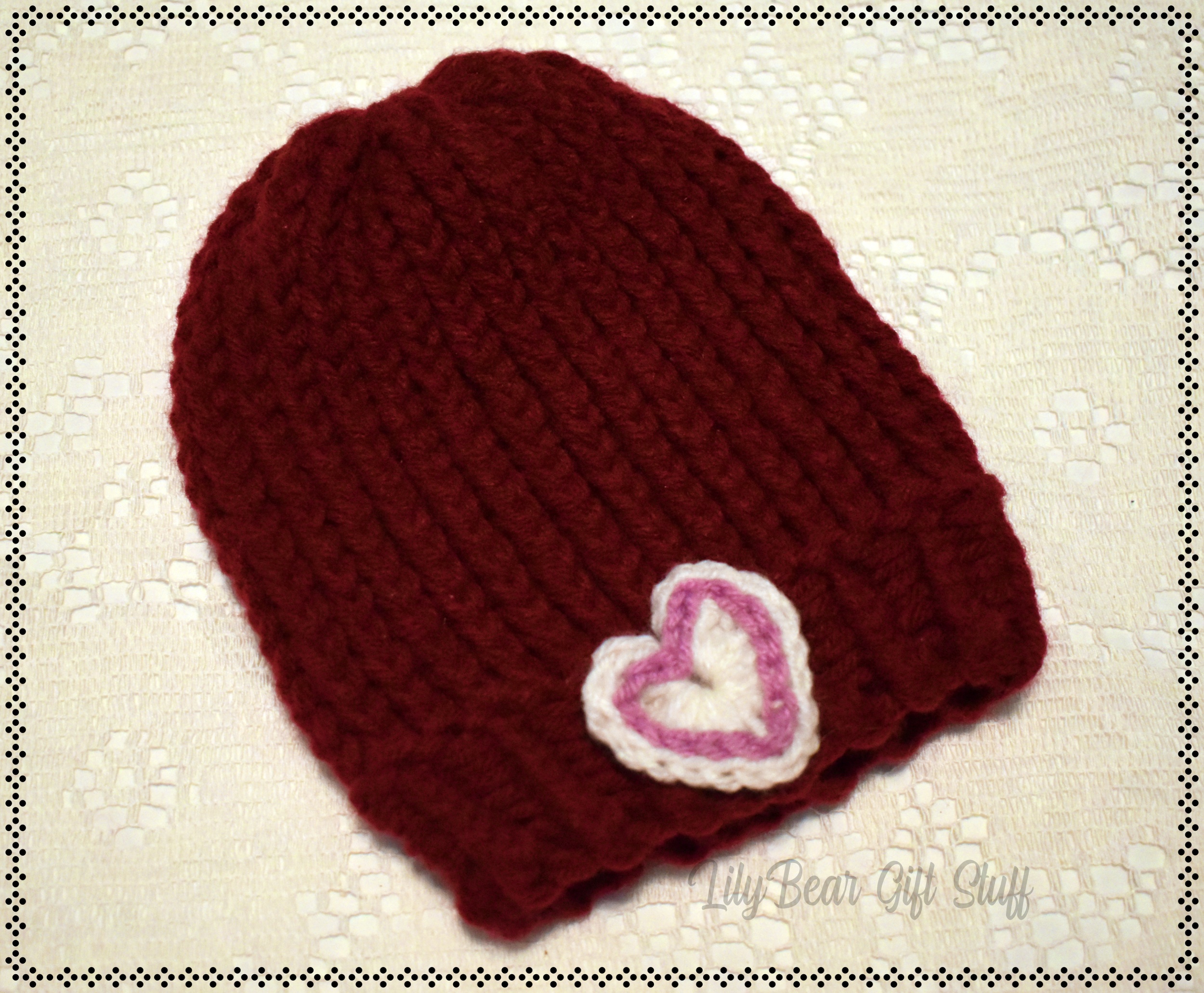 Burgundy with Heart Newborn to 3 months Winter Hat, Loom Knit