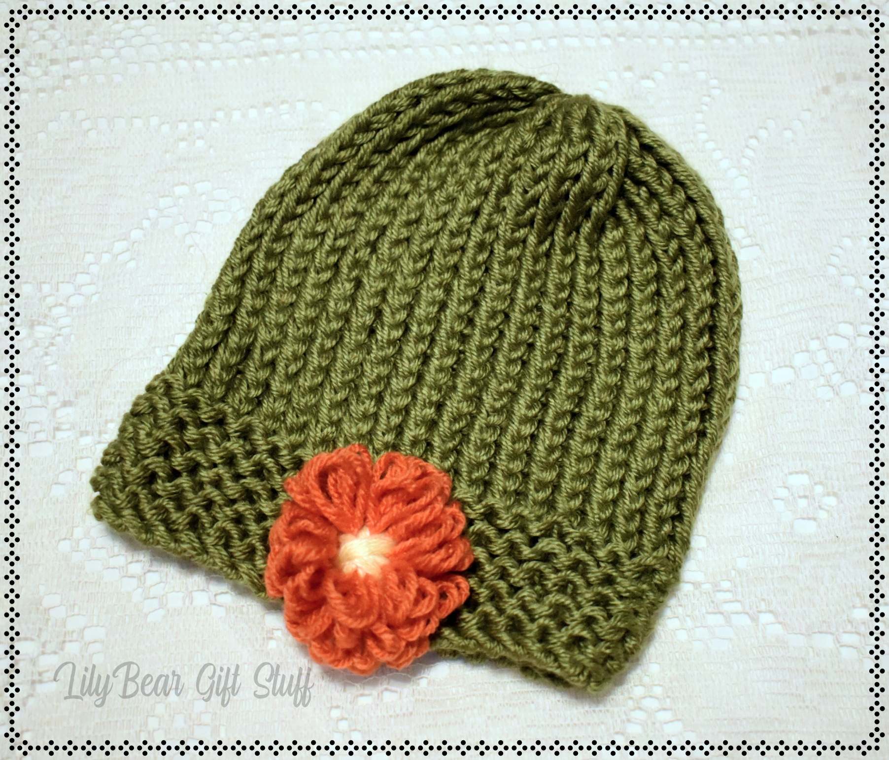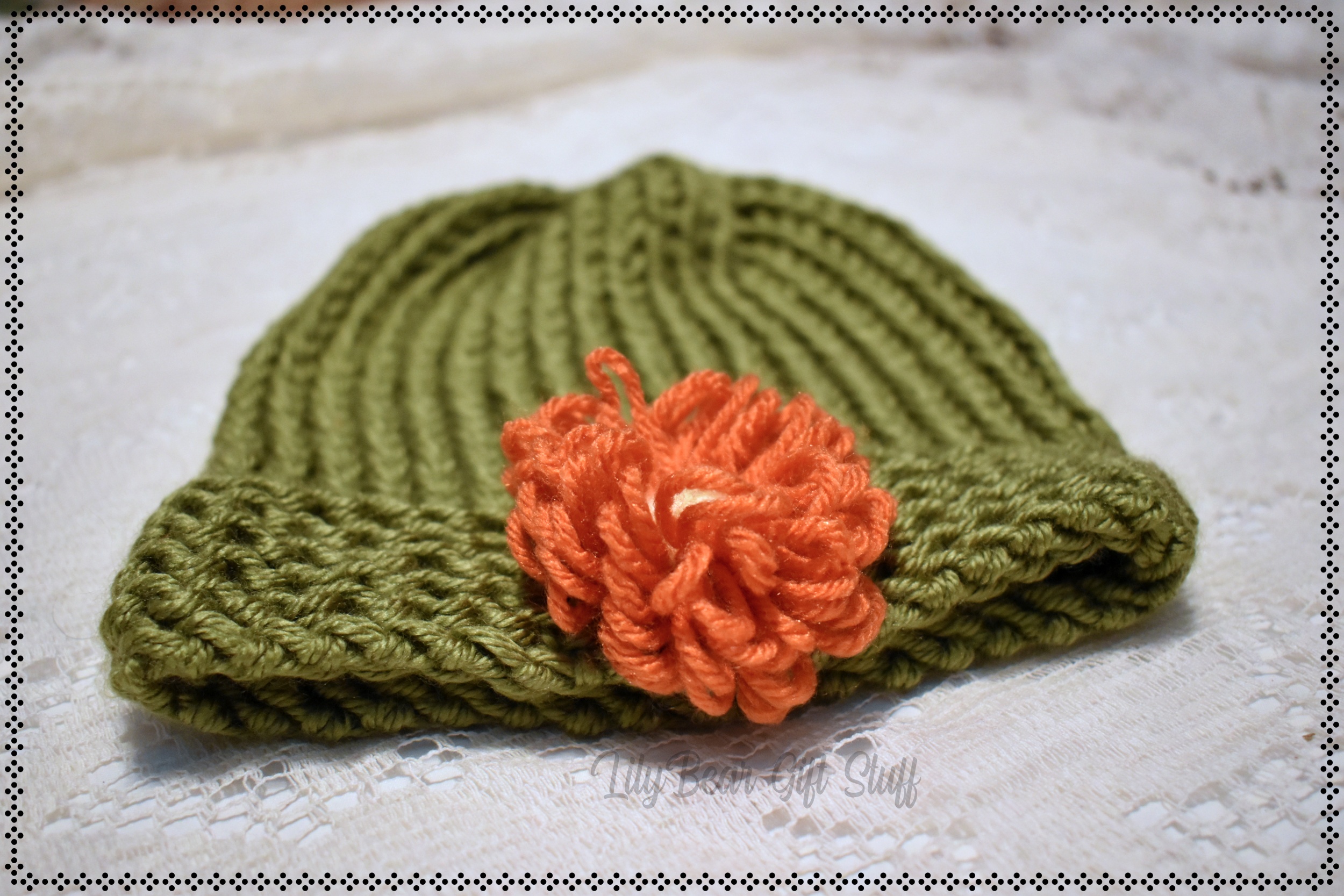 Very comfy and warm, this loom knit hat is a toddler size and comes in a sage green color and an orange flower. It will keep your toddler's head cozy!