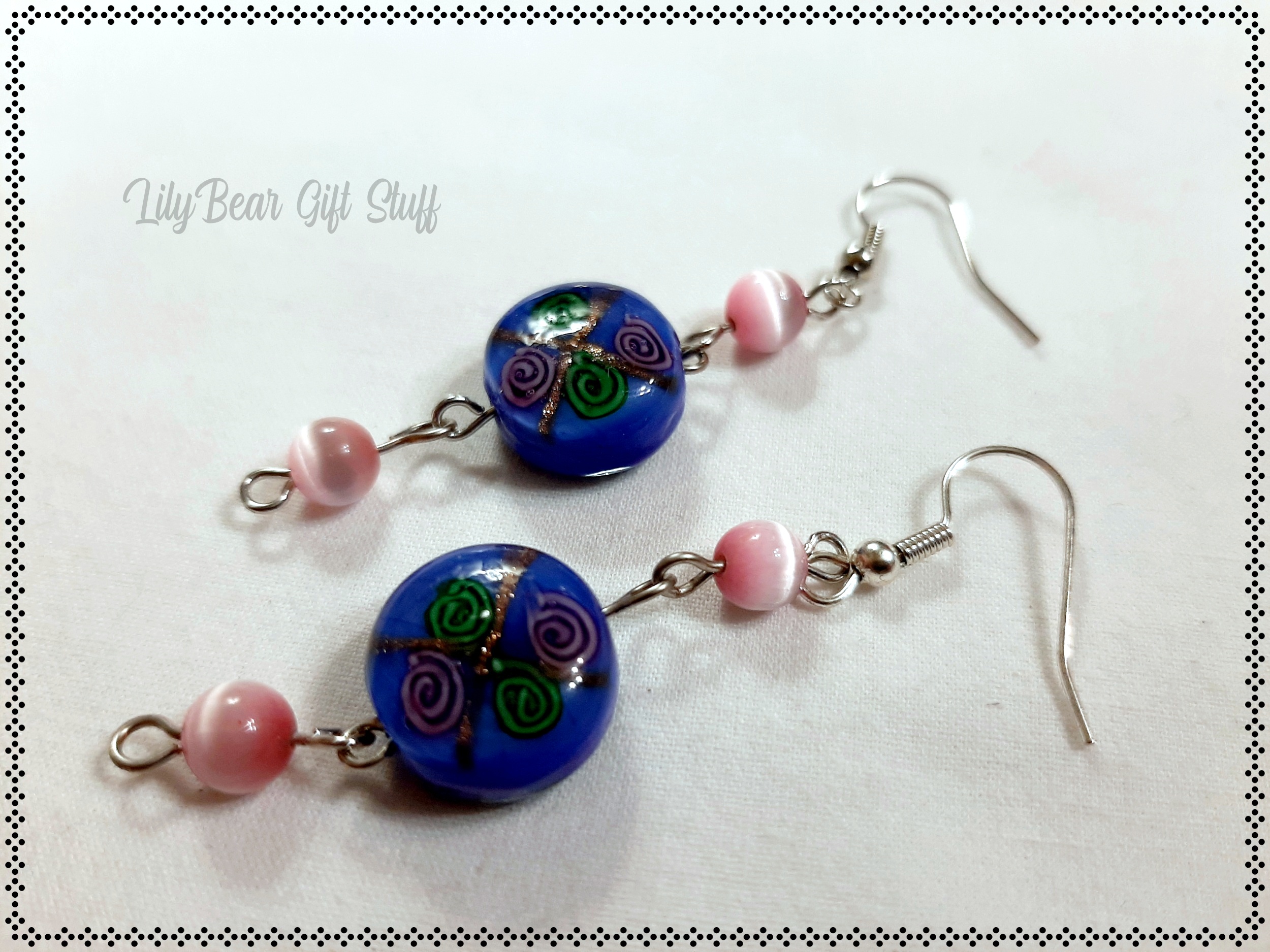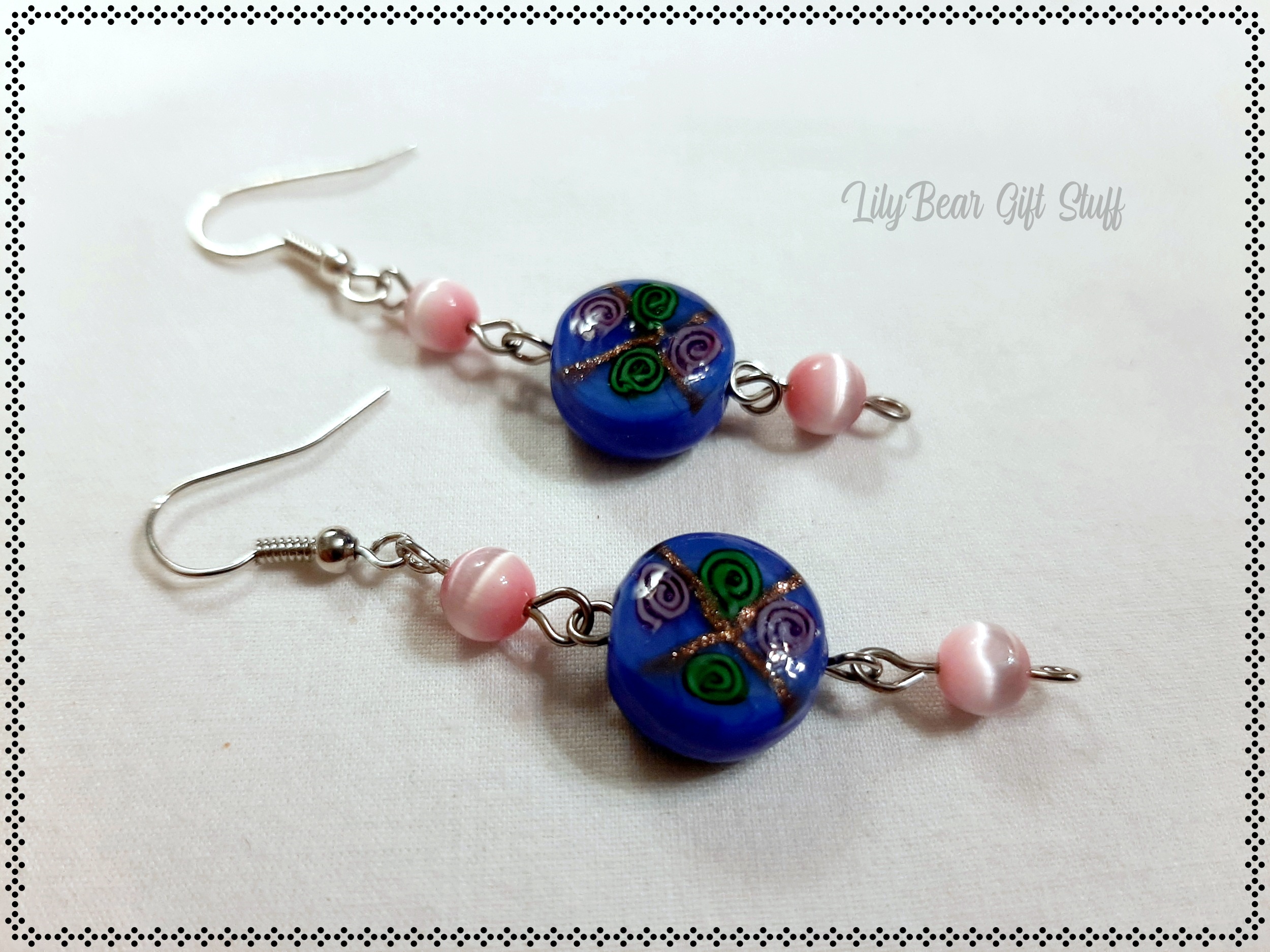Cute and simple set of earrings made with blue glass beads with pink flowers on them and pink cats eye beads! I can fix these to have ear posts or clip on's if preferred