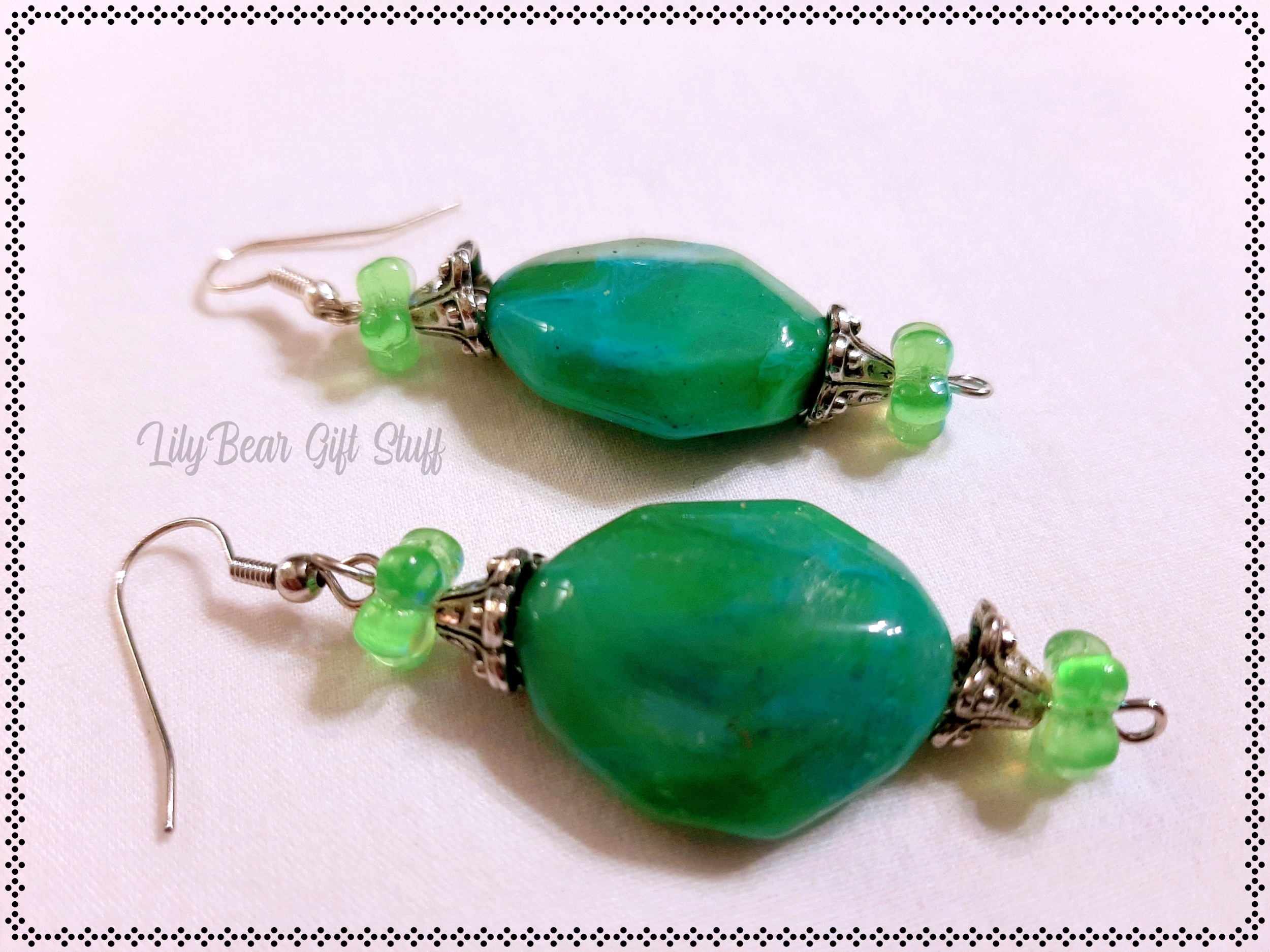 Cute and simple earrings made with green acrylic beads and small green glass flower beads.