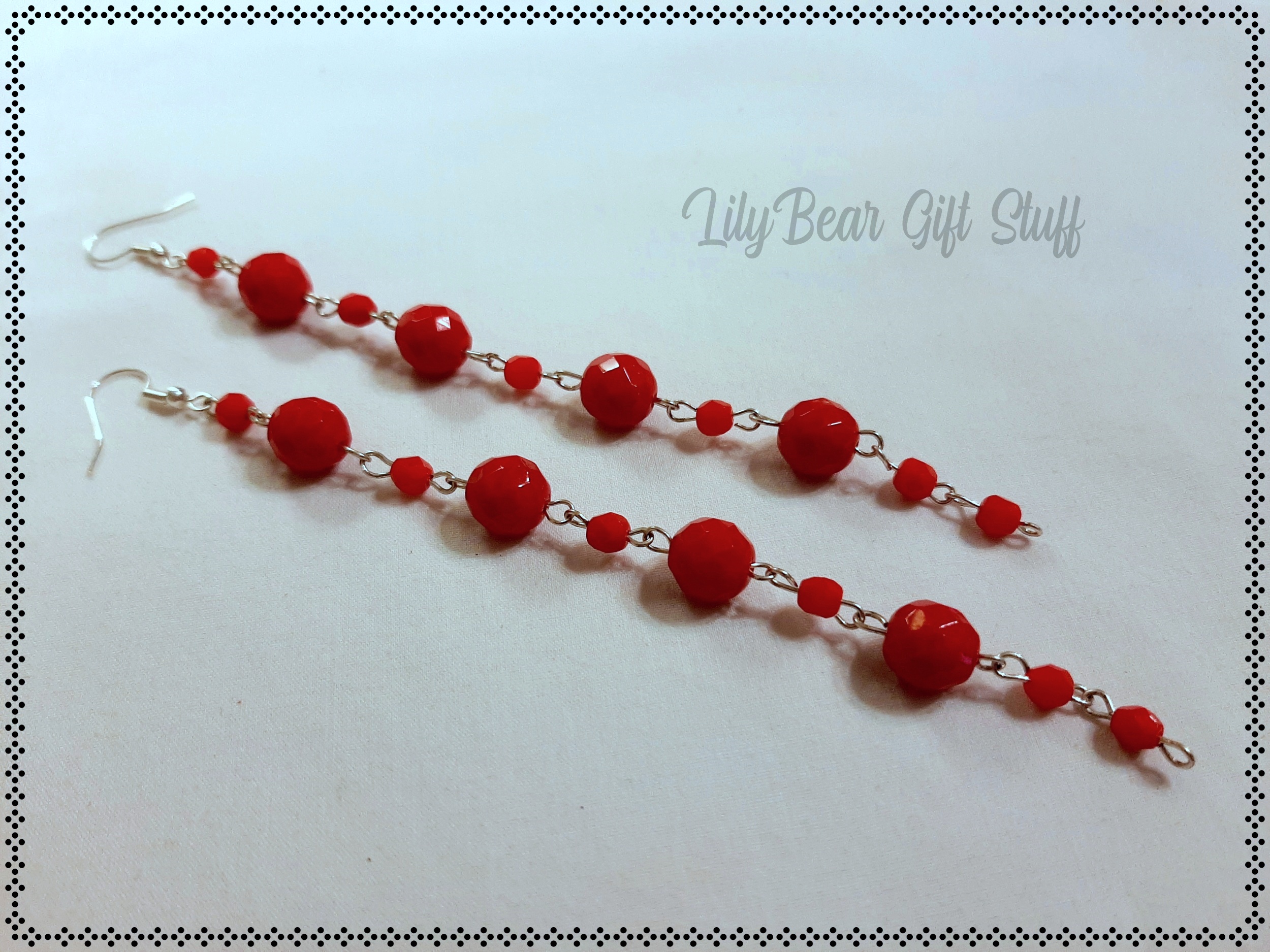 Cute and simple earrings made with red glass beads! They are 6 inches long