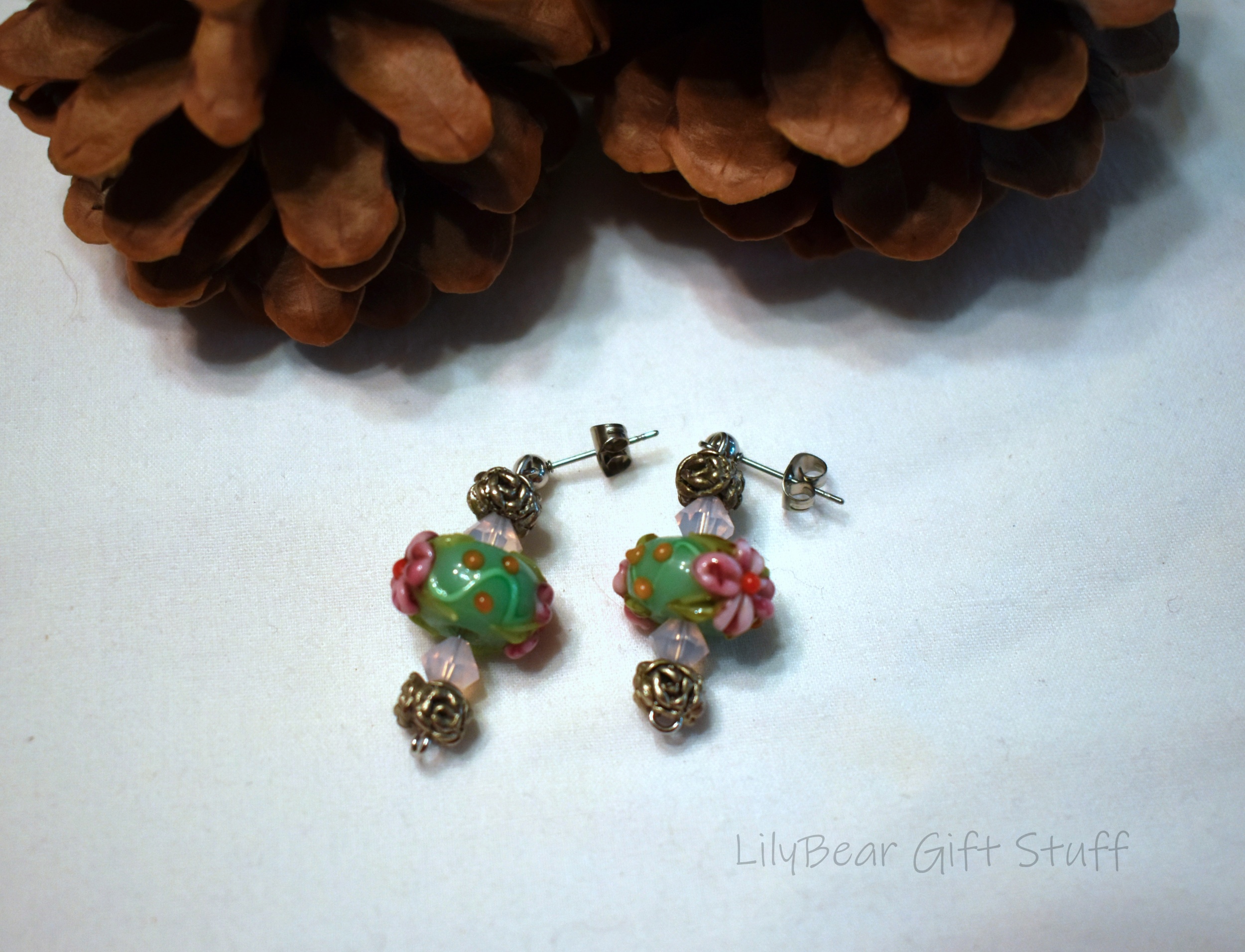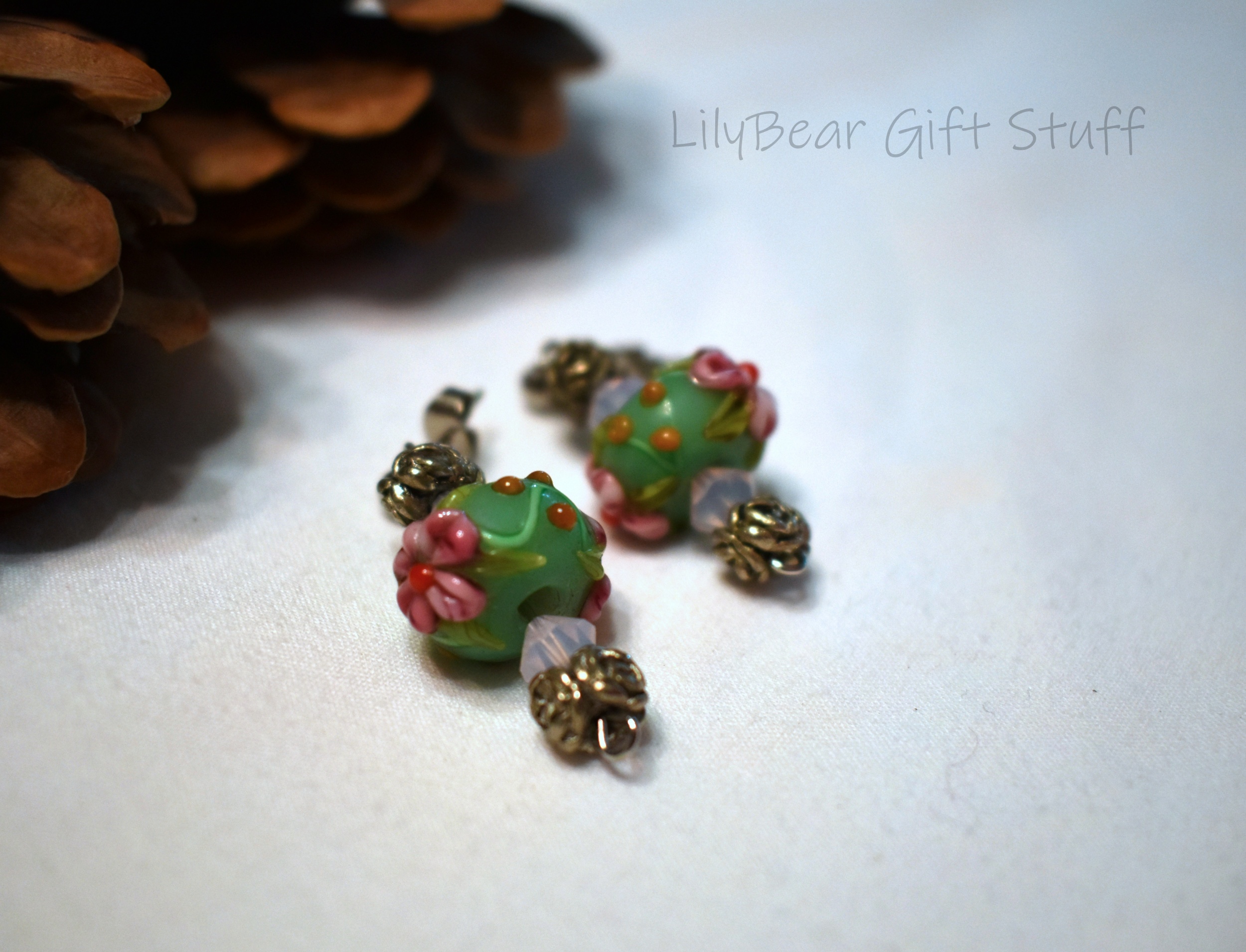 A cute and simple earrings made with green lampwork beads with pink flowers.