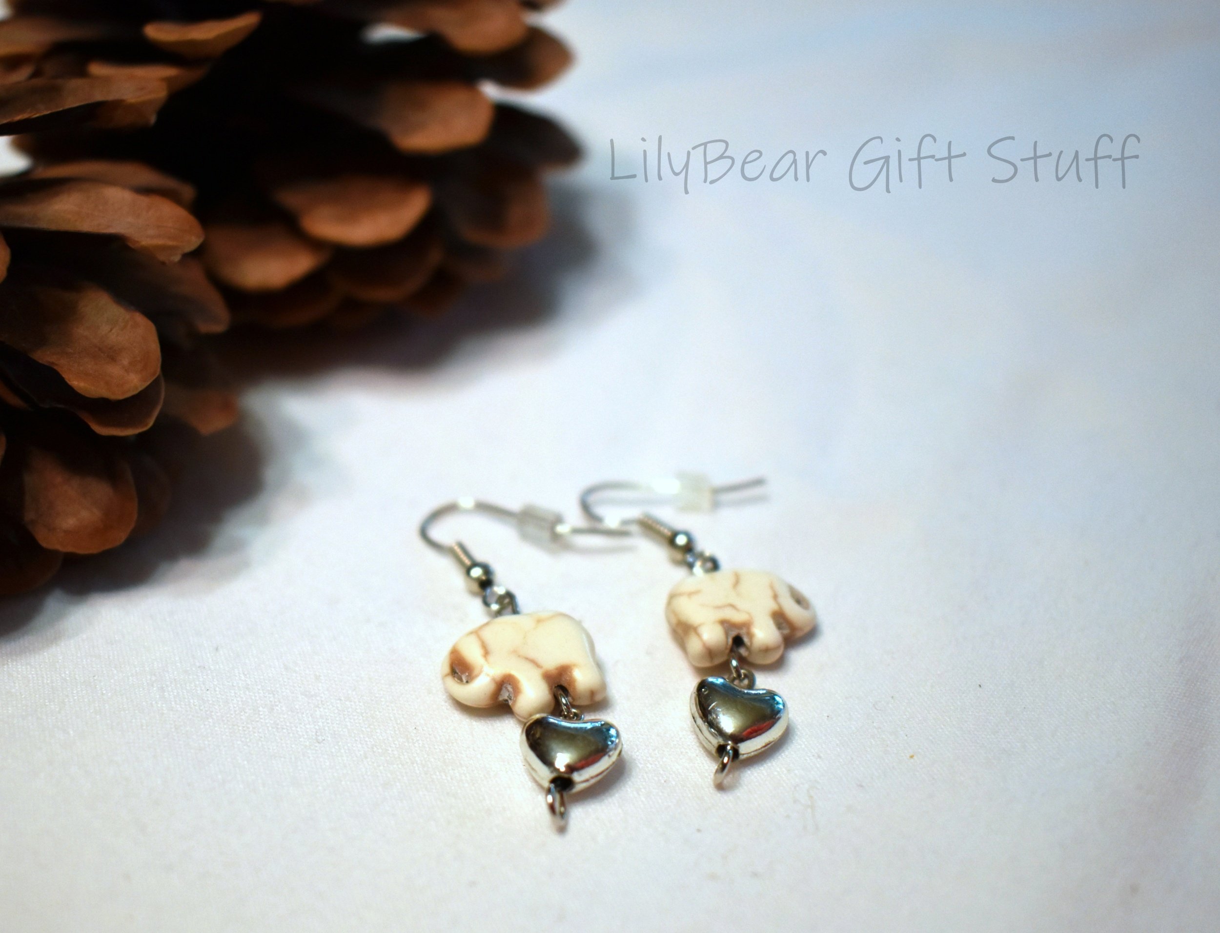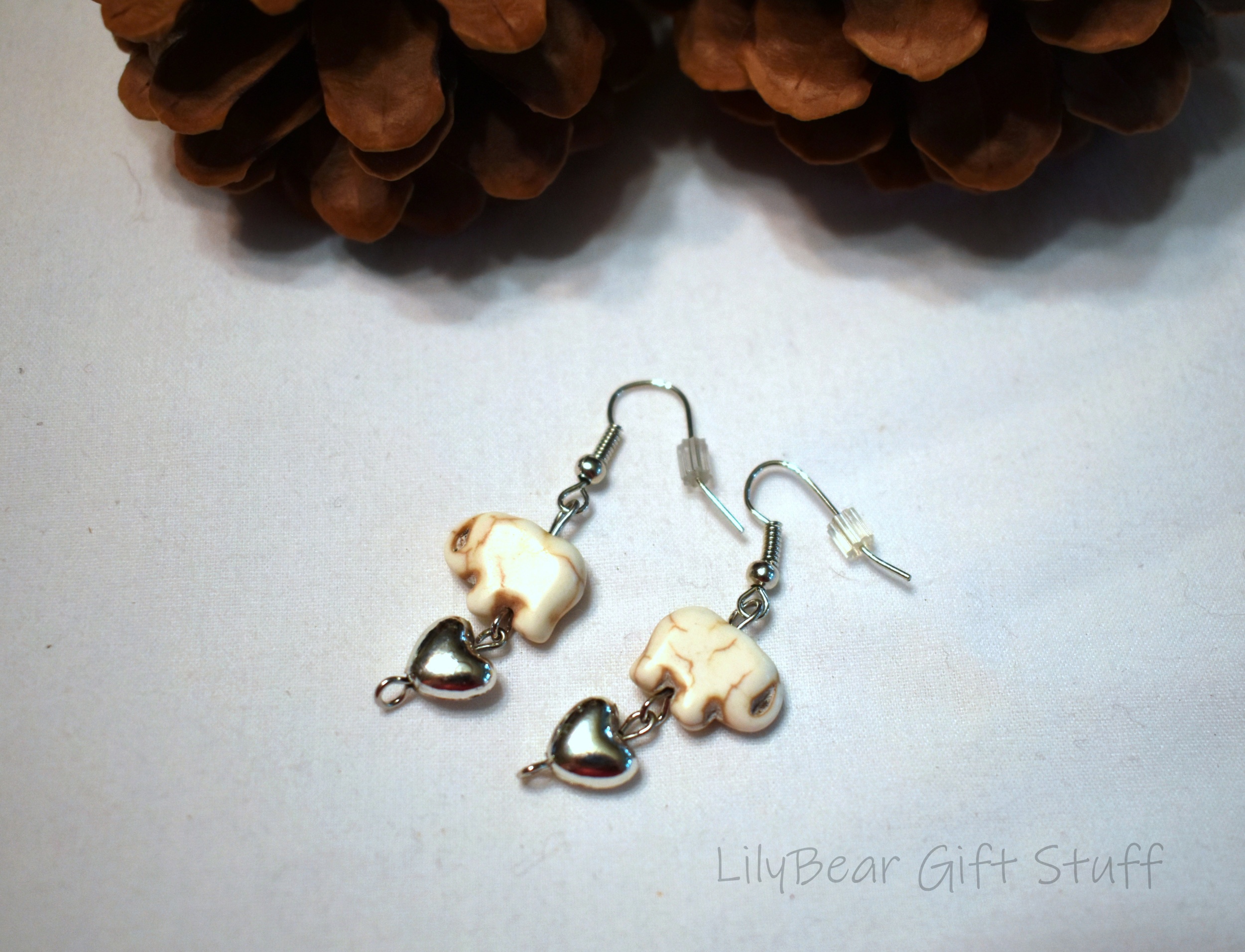 Cute and simple earrings made with white elephants beads and silver heart beads.