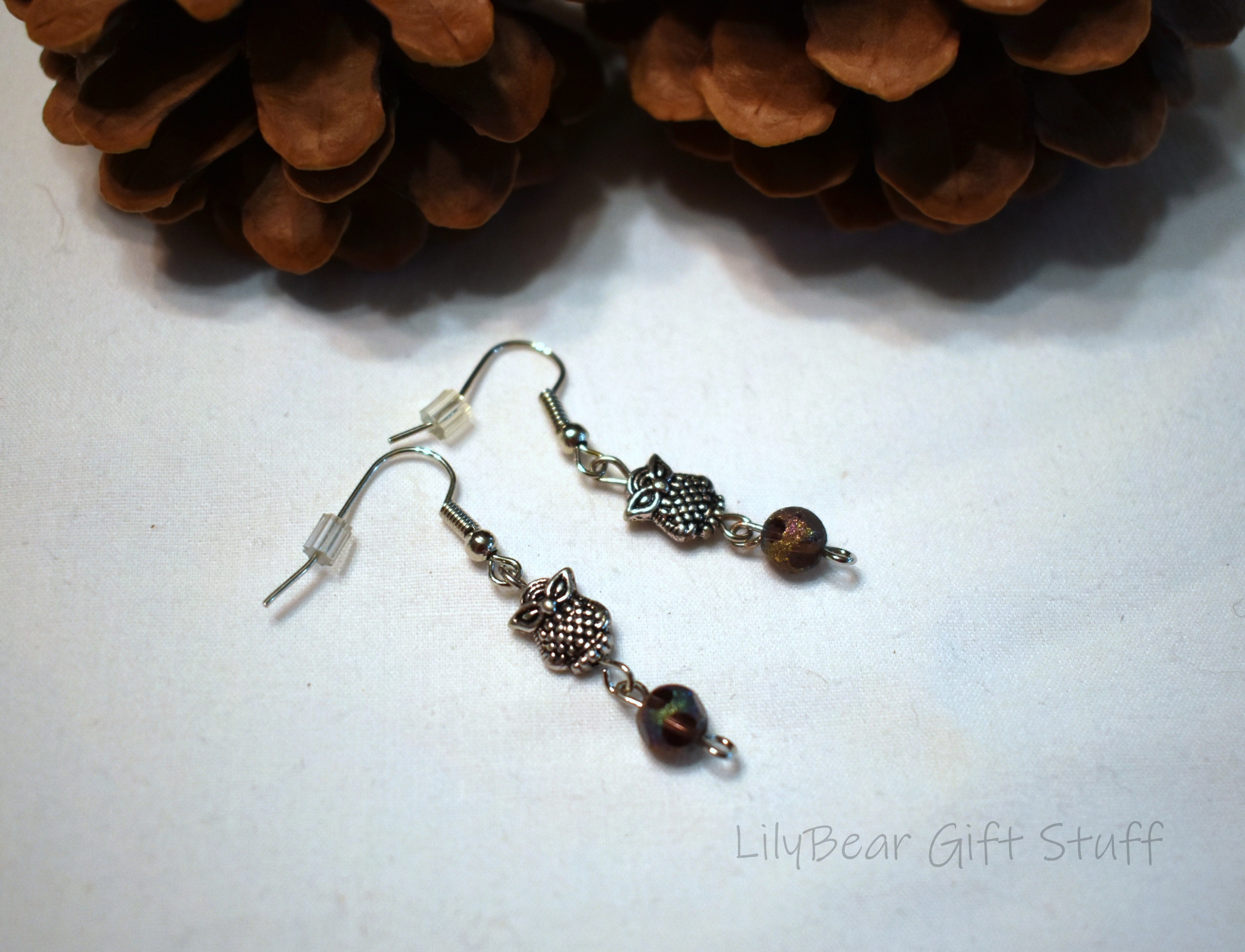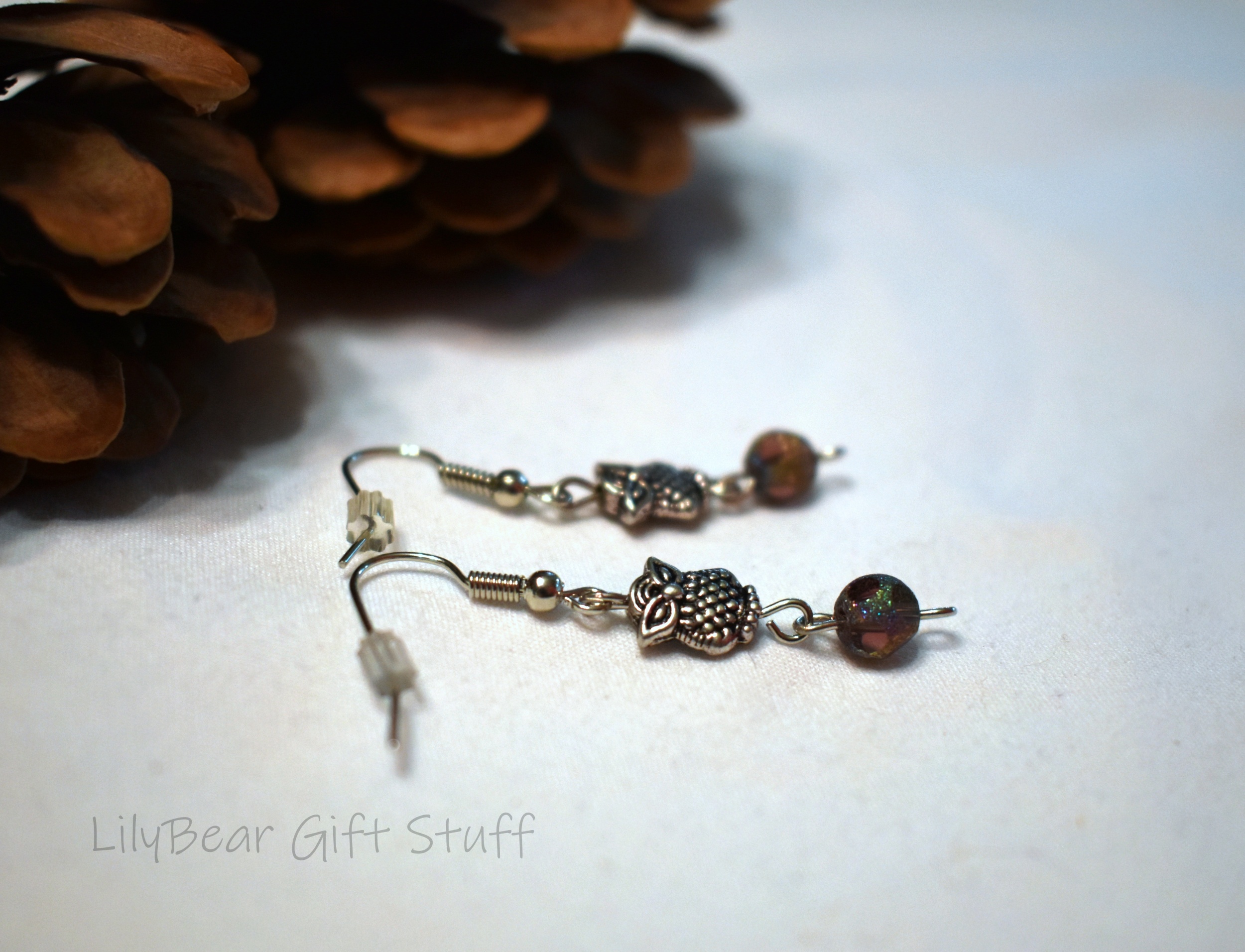 Cute and simple earrings made with silver owl charms and purple glass beads.